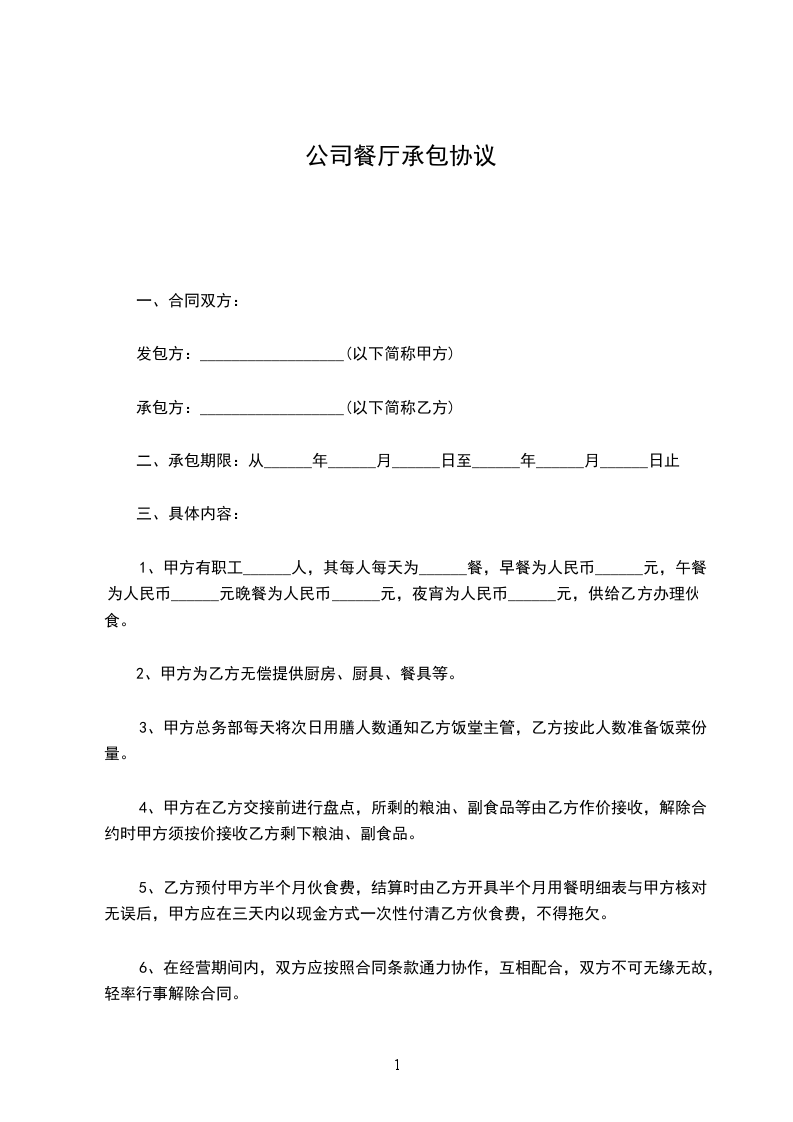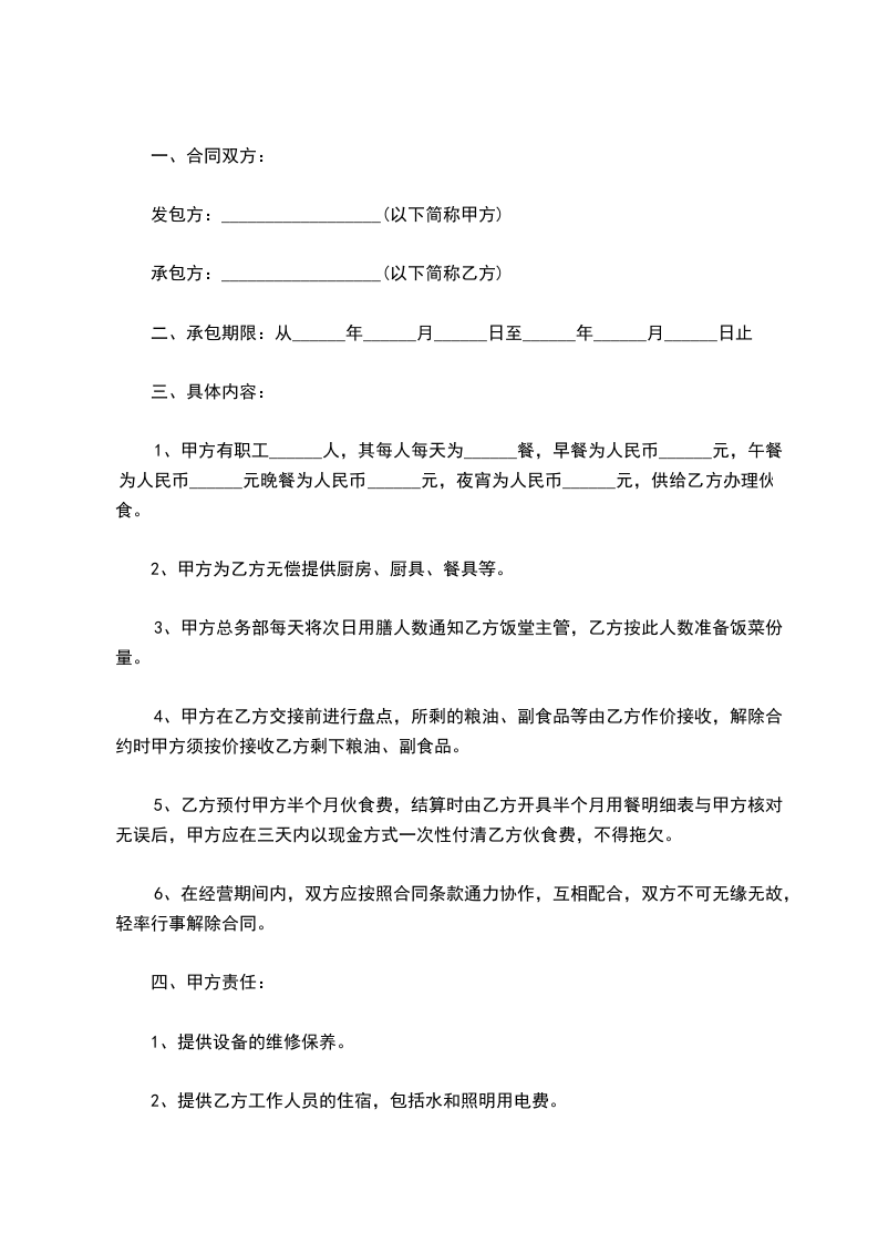3.承包期内,甲方负责水电费,乙方负责餐厅卫生费、燃气费及其它费用。