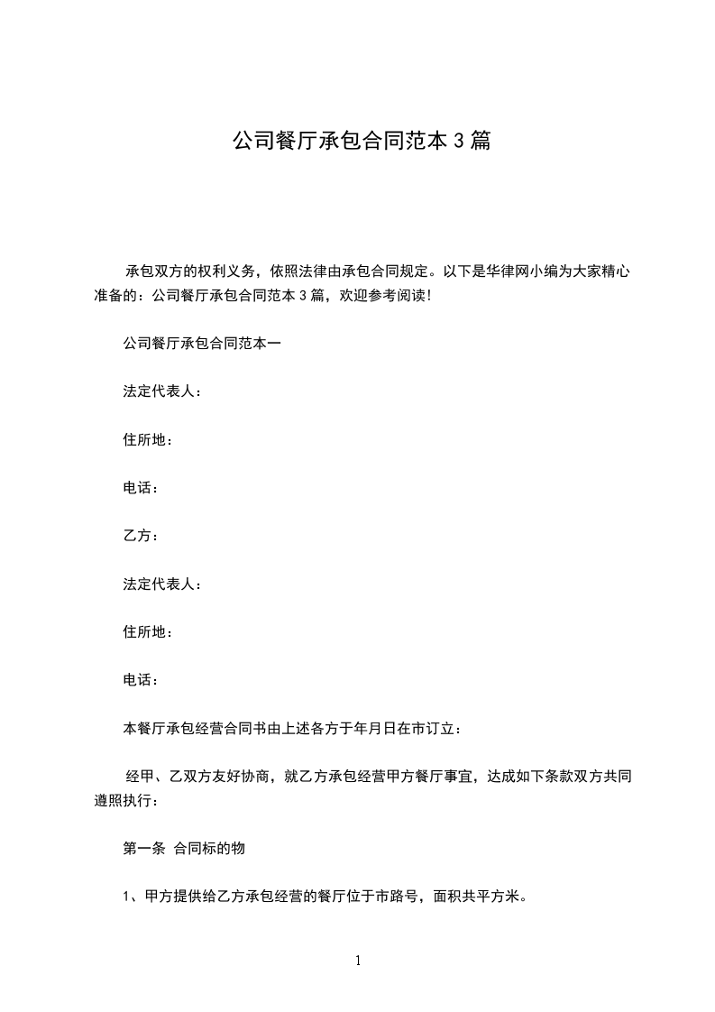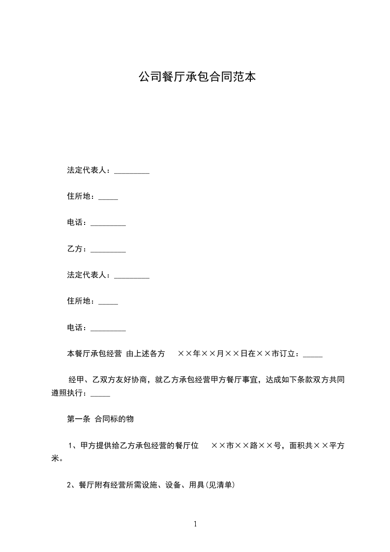 1、甲方提供给乙方承包经营的餐厅位于市路号,面积共平方米。