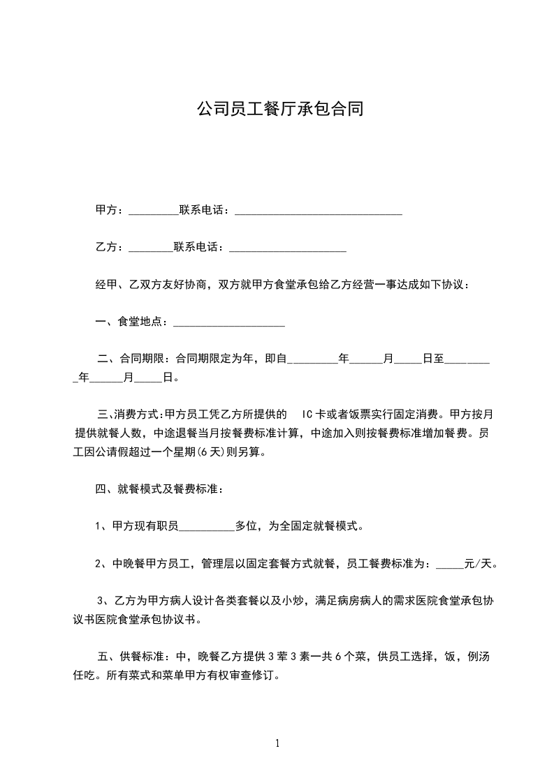 为对员工餐厅综合管理,提高员工膳食标准,经甲、乙双方通过友好协商,本着平等互利的原则,同意员工餐厅由乙方承包经营。为明确双方的权利和义务,特订立本合同。