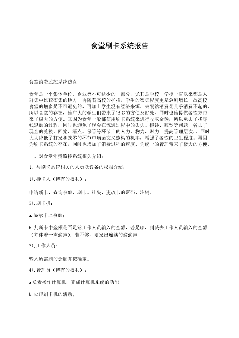 1),饭卡管理有以下几个方面:饭卡充值、饭卡挂失、解除挂失、补发新卡以及退卡;