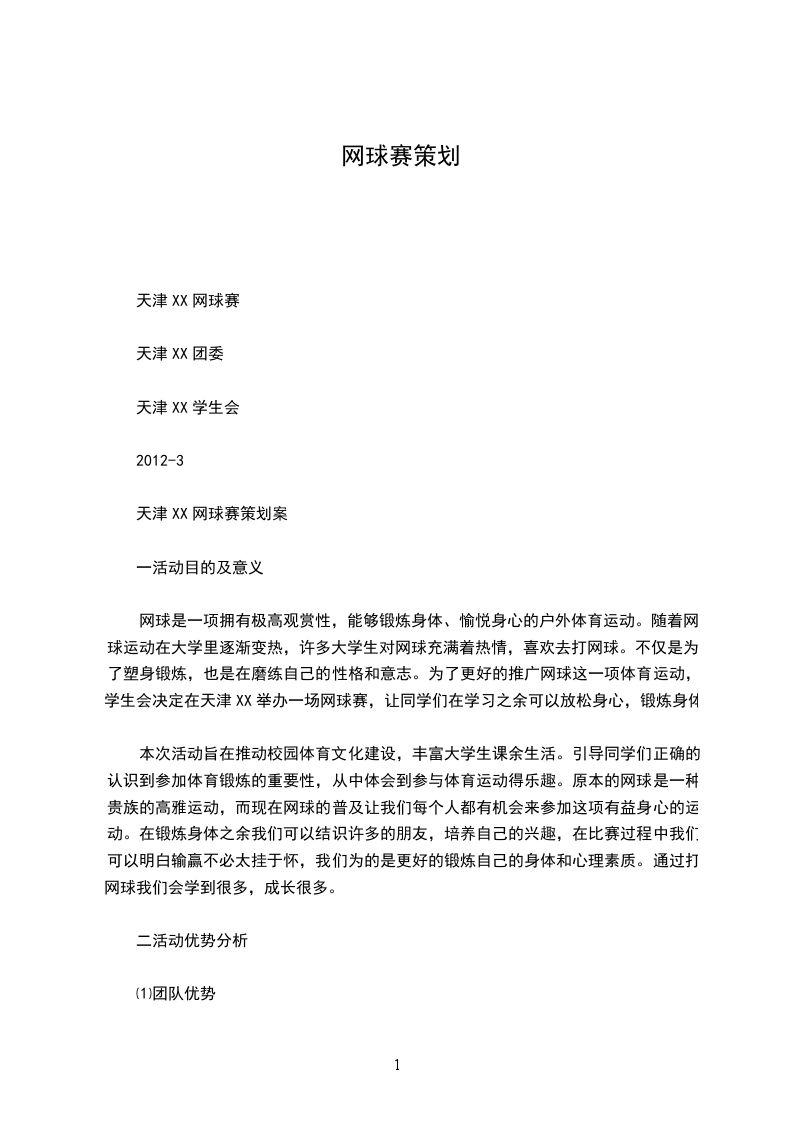 网球是一项拥有极高观赏性,能够锻炼身体、愉悦身心的户外体育运动。随着网球运动在大学里逐渐变热,许多大学生对网球充满着热情,喜欢去打网球。不仅是为了塑身锻炼,也是在磨练自己的性格和意志。为了更好的推广网球这一项体育运动,学生会决定在天津XX举办一场网球赛,让同学们在学习之余可以放松身心,锻炼身体。