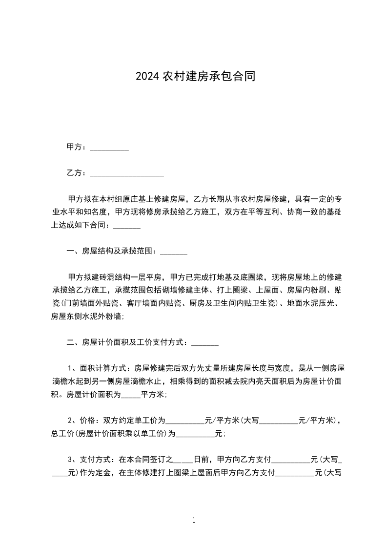 甲方拟建砖混结构一层平房,甲方已完成打地基及底圈梁,现将房屋地上的修建承揽给乙方施工,承揽范围包括砌墙修建主体、打上圈梁、上屋面、房屋内粉刷、贴瓷(门前墙面外贴瓷、客厅墙面内贴瓷、厨房及卫生间内贴卫生瓷)、地面水泥压光、房屋东侧水泥外粉墙;