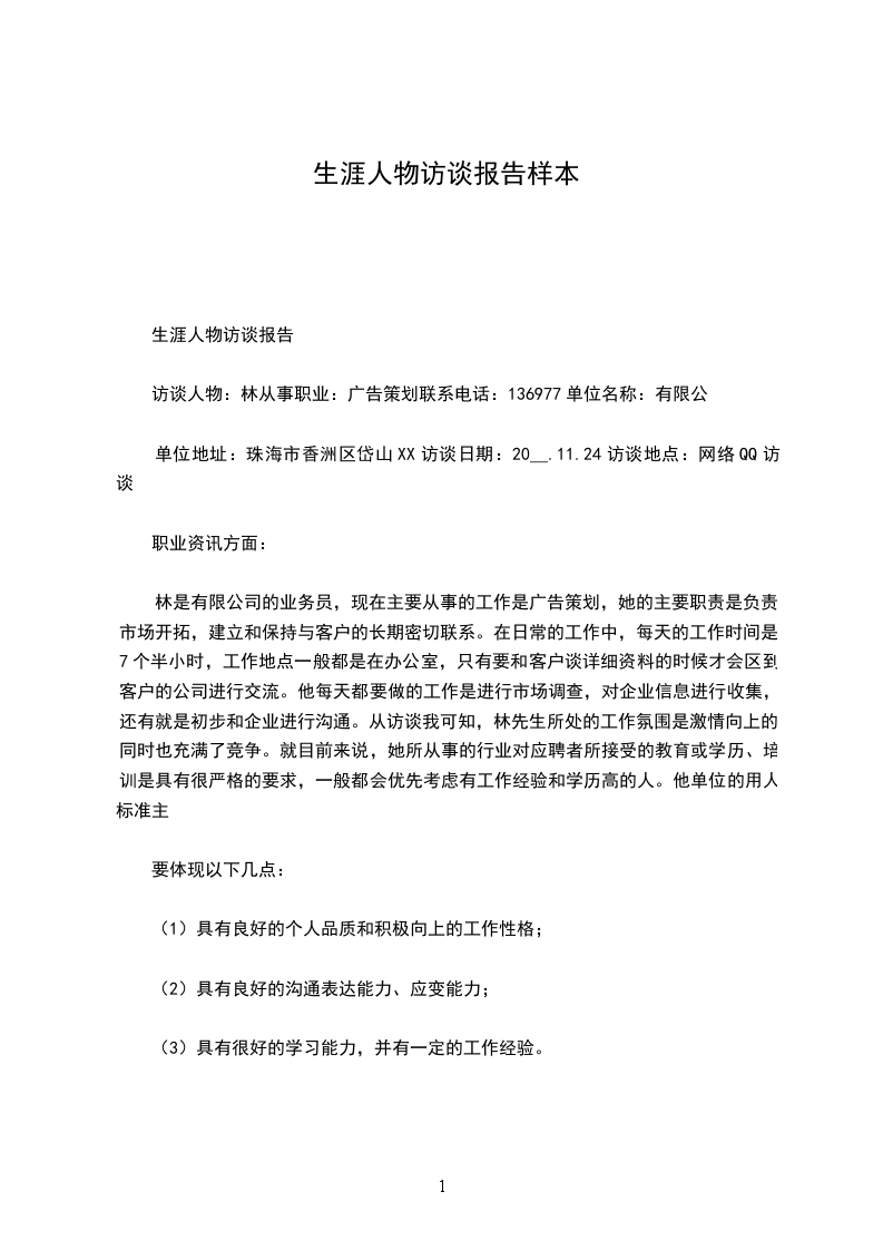 这次完成的对有限公司广告策划业务员林的生涯人物访谈,我深刻体会到了对人物生涯进行访谈对我们确立职业发展方向是有很大帮助的,同时,我也从中学到了很多东西,其中,感触最深的是在择业之前准确