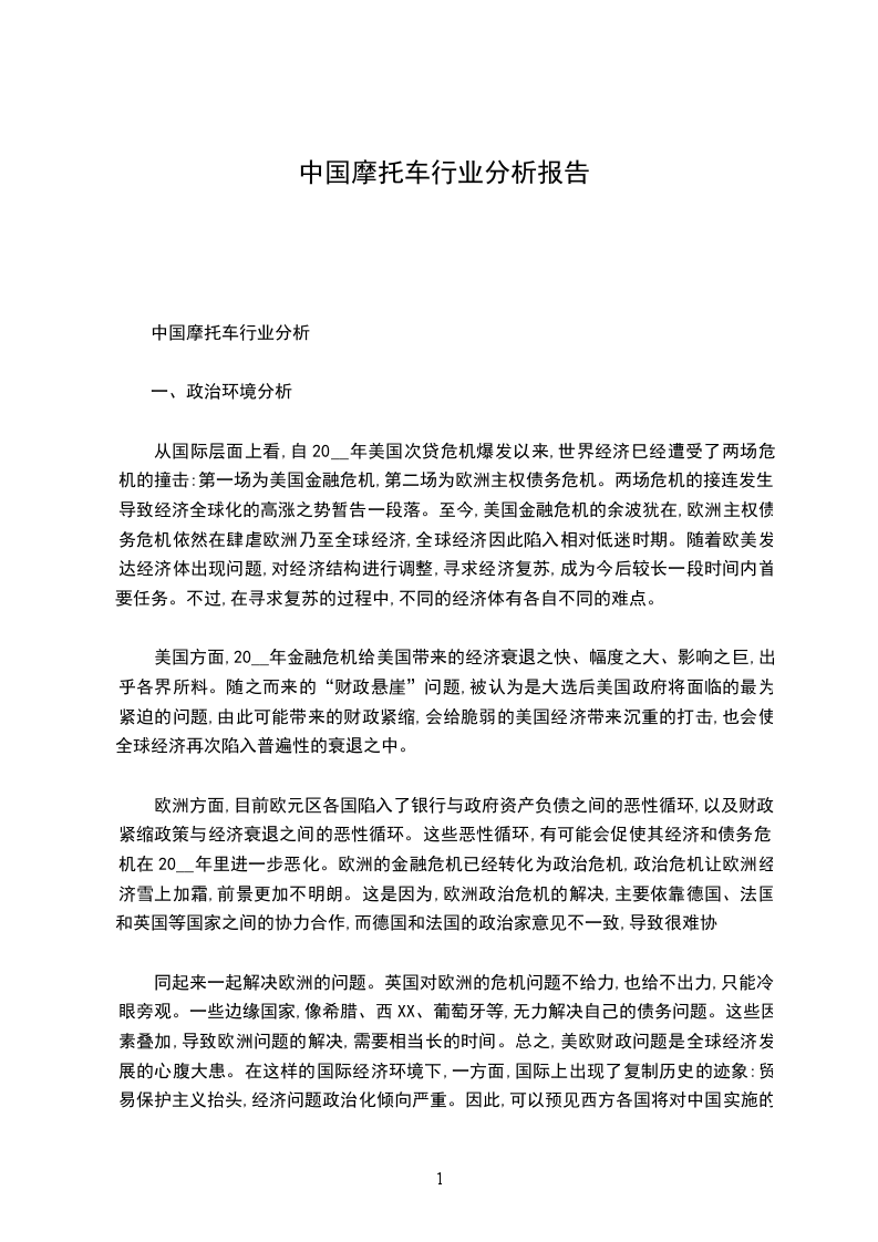 除了合资企业外,20__年,中国的摩托车市场涌现了一系列国际品牌,XX、XX、XX、XX等欧美品牌相继进入中国市场。XX在中国市场已耕耘多年,目前己建立了完善的经销商网络。20__年XX工作重心转移到营销上,幵展各种车友会和骑行活动,加大市场推广力度,显示出XX在中W市场上已经进入扩张期。XX在今年被XX收购后,将借助国内XX辉腾的渠道进行销售。來自法国的踏板新贵XX,在20__年的摩博会展会上,展出了十余款欧式风格的踏板车,显示出XX进攻中国市场的志向。据传,在欧系东来之时,F1本的川崎与隆盡达成了合作协议,规划在国内生产小忍者和越野车。这些新进入者目的明确、定位精准、手段丰富,给沉闷的屮国摩托车市场带来新的竞争景象的同时,让中国的摩托车市场竞争更加白热化。
