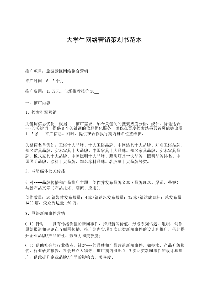 (1)针对----具有传播价值的新闻事件,挖掘新闻价值,形成系列话题,组织、创作原始报道和评论在互联网传播,推广期内实现2次此类新闻事件的设计和推广,借此提升企业品牌/产品的性、影响力和美誉度;