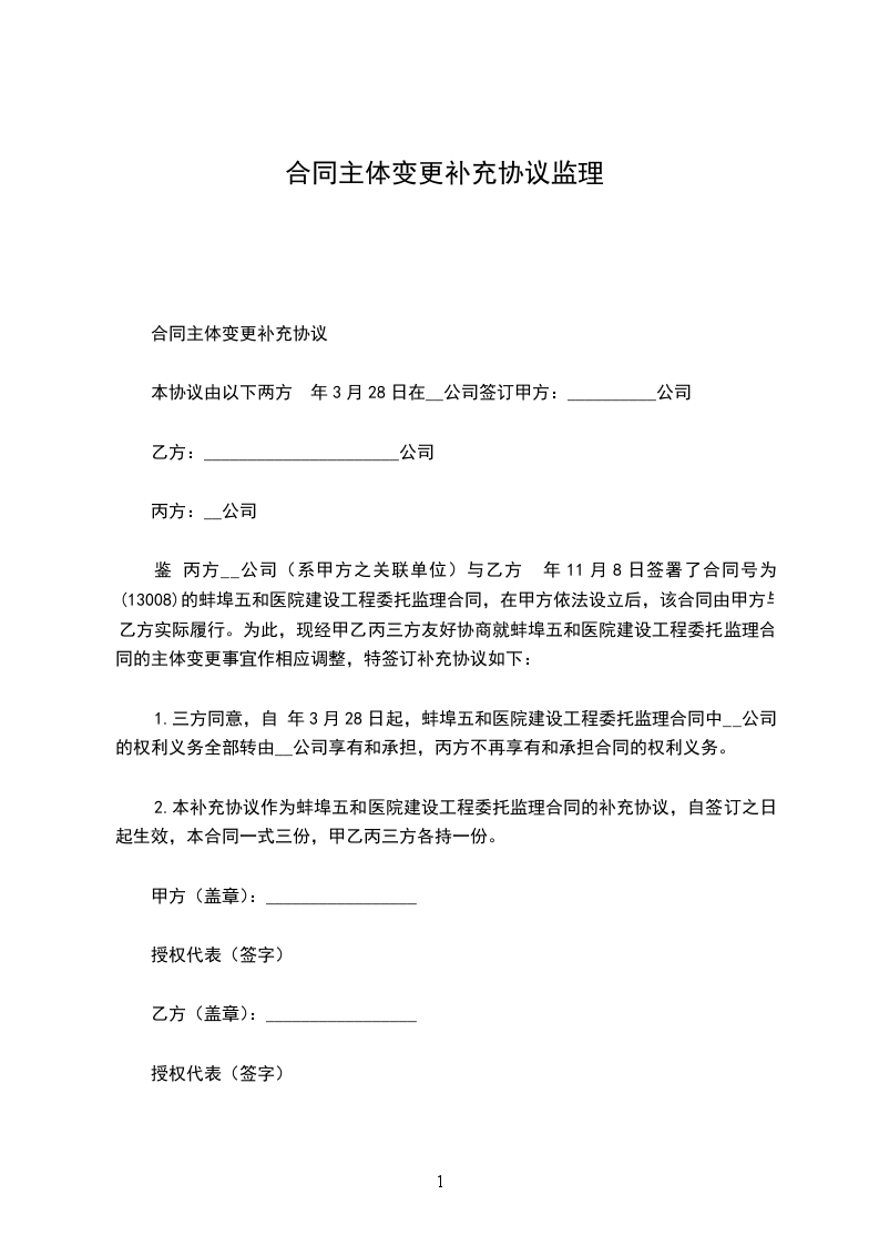 鉴 丙方__公司(系甲方之关联单位)与乙方 年11月8日签署了合同号为(13008)的蚌埠五和医院建设工程委托监理合同,在甲方依法设立后,该合同由甲方与乙方实际履行。为此,现经甲乙丙三方友好协商就蚌埠五和医院建设工程委托监理合同的主体变更事宜作相应调整,特签订补充协议如下: