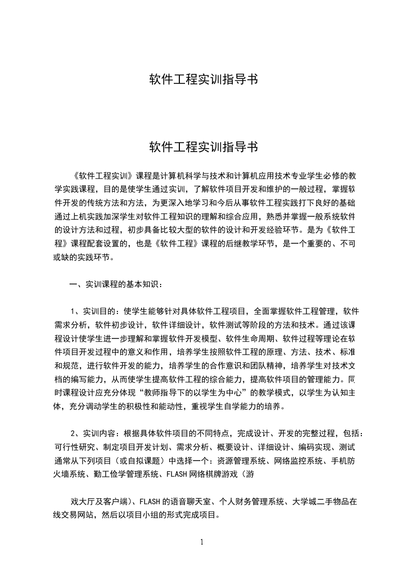 《软件工程实训》课程是计算机科学与技术和计算机应用技术专业学生必修的教学实践课程,目的是使学生通过实训,了解软件项目开发和维护的一般过程,掌握软件开发的传统方法和方法,为更深入地学习和今后从事软件工程实践打下良好的基础。通过上机实践加深学生对软件工程知识的理解和综合应用,熟悉并掌握一般系统软件的设计方法和过程,初步具备比较大型的软件的设计和开发经验环节。是为《软件工程》课程配套设置的,也是《软件工程》课程的后继教学环节,是一个重要的、不可或缺的实践环节。