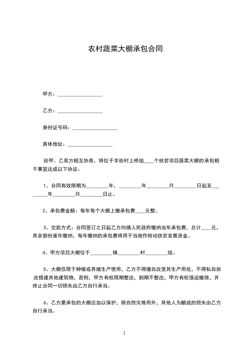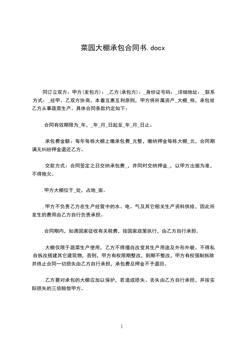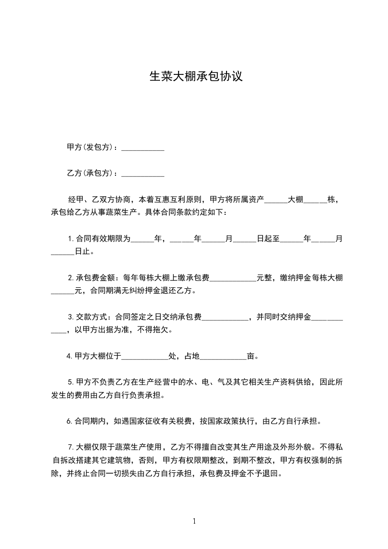 经甲、乙双方协商,本着互惠互利原则,甲方将所属资产______大棚______栋,承包给乙方从事蔬菜生产。具体合同条款约定如下: