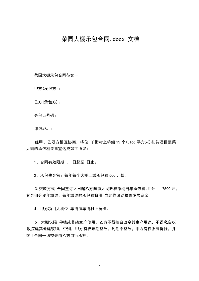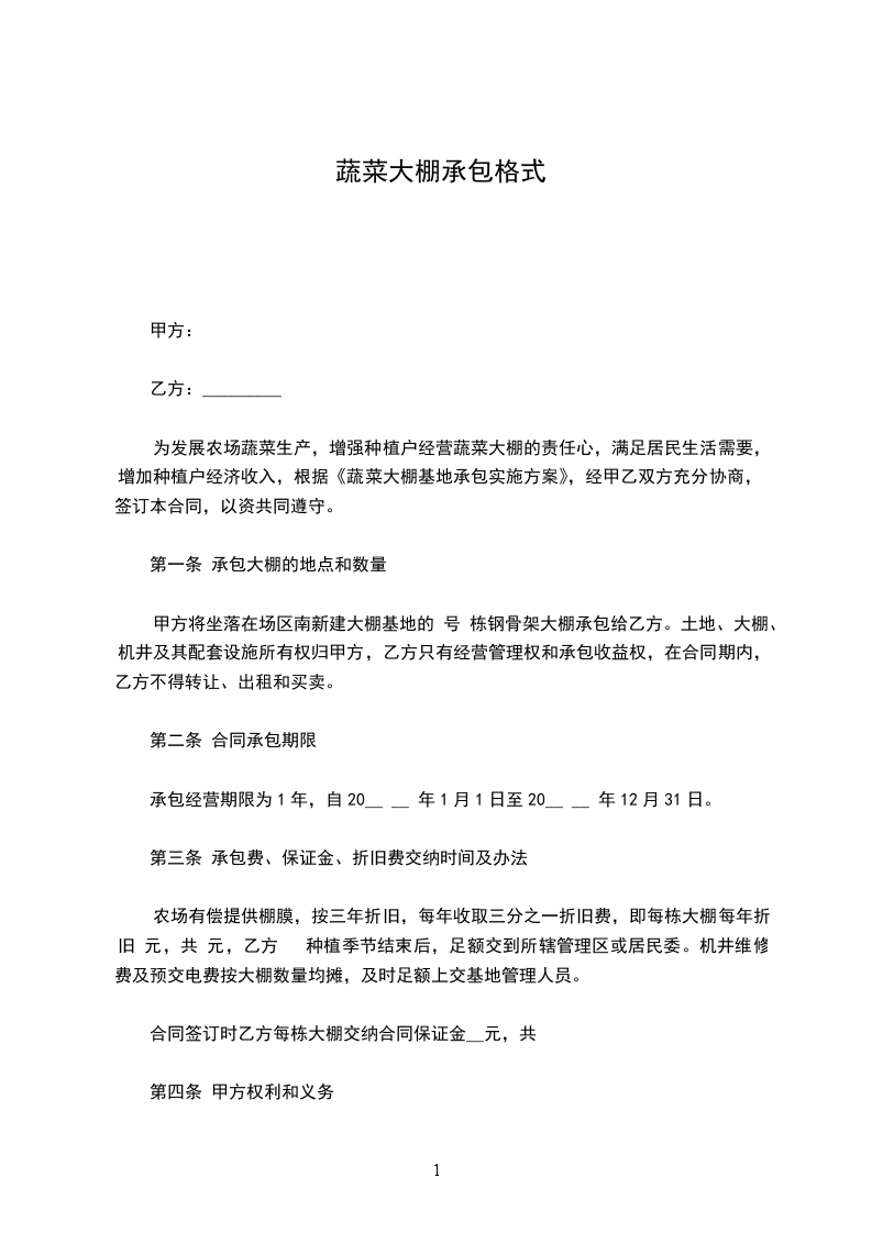 一、承包限期为 年 月 日至 年 月日止。 二、承包费金额:每年每座大棚应缴承包费 ( 整)元整。