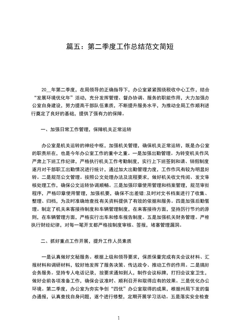 一是认真做好文秘服务。根据上级和领导要求,保质保量完成有关会议材料、汇报材料和调研材料,较好地发挥了服务决策、传达政令、推动工作的作用。二是搞好会务服务。坚持专人电话记录,按要求通知到人,制作会议标牌,打扫会议室卫生,做好会前各项准备工作,确保会议准时、顺利召开和取得应有的效果。三是优化办公环境。第二季度,办公室为夯实争创“四优”办公室取得的成果,根据州局下发的督办通报,认真查找自身问题,逐个进行修整,定期开展学习活动。五是落实安全检查,将安全检查列为工作重点,迅速整改落实反馈问题。对县局消防设施、食品卫生、票证库房、信访保密等重点部位、重点环节进行了全面检查。六是积极开展信息宣传,优化税收工作环境。在新闻宣传上,主要围绕税收中心工作,加大国税形象宣传力度,第二季度,《___日报》上稿_篇,《__日报》上稿_篇,加强内外网站建设,及时更新信息,加强网站维护,树立了良好的基层国税部门形象。