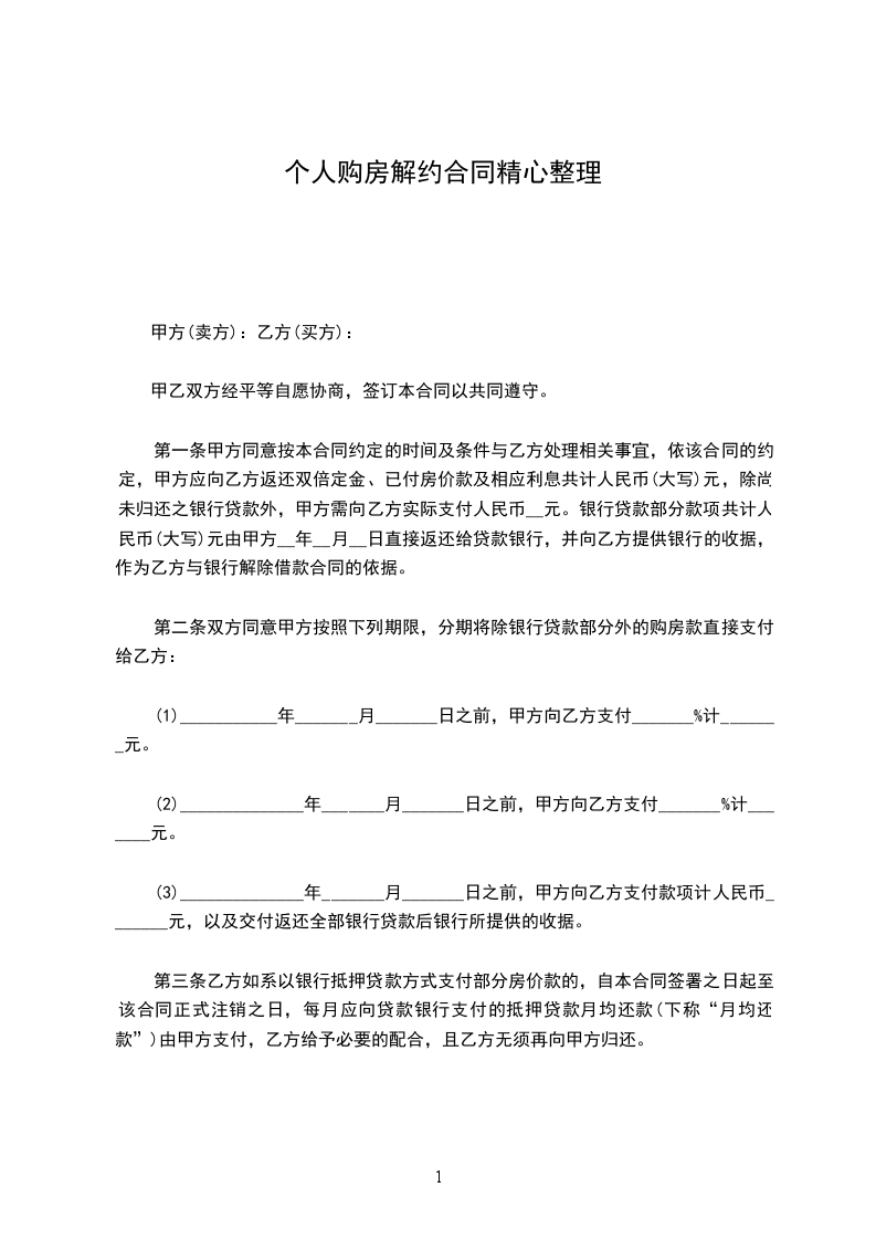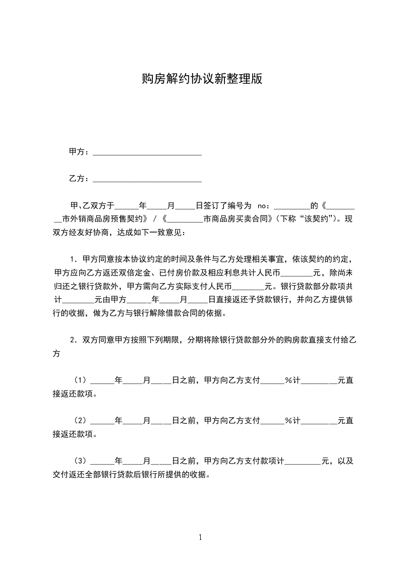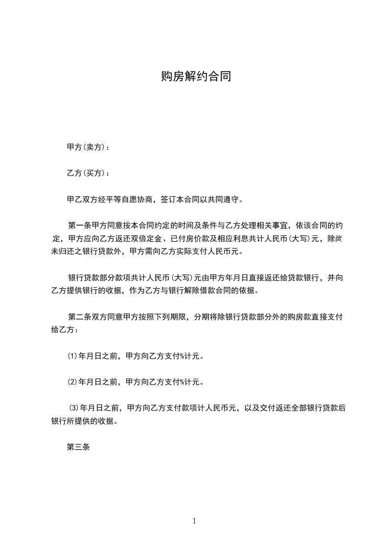 1.甲方同意按本协议约定的时间及条件与乙方处理相关事宜,依该契约的约定,甲方应向乙方返还双倍定金、已付房价款及相应利息共计人民币________元,除尚未归还之银行贷款外,甲方需向乙方实际支付人民币________元。银行贷款部分款项共计________元由甲方______年_____月_____日直接返还予贷款银行,并向乙方提供银行的收据,做为乙方与银行解除借款合同的依据。