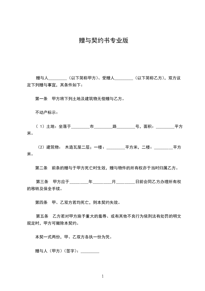 赠与人_________(以下简称甲方)、受赠人_________(以下简称乙方),双方议定下列赠与事宜,其条件如下: