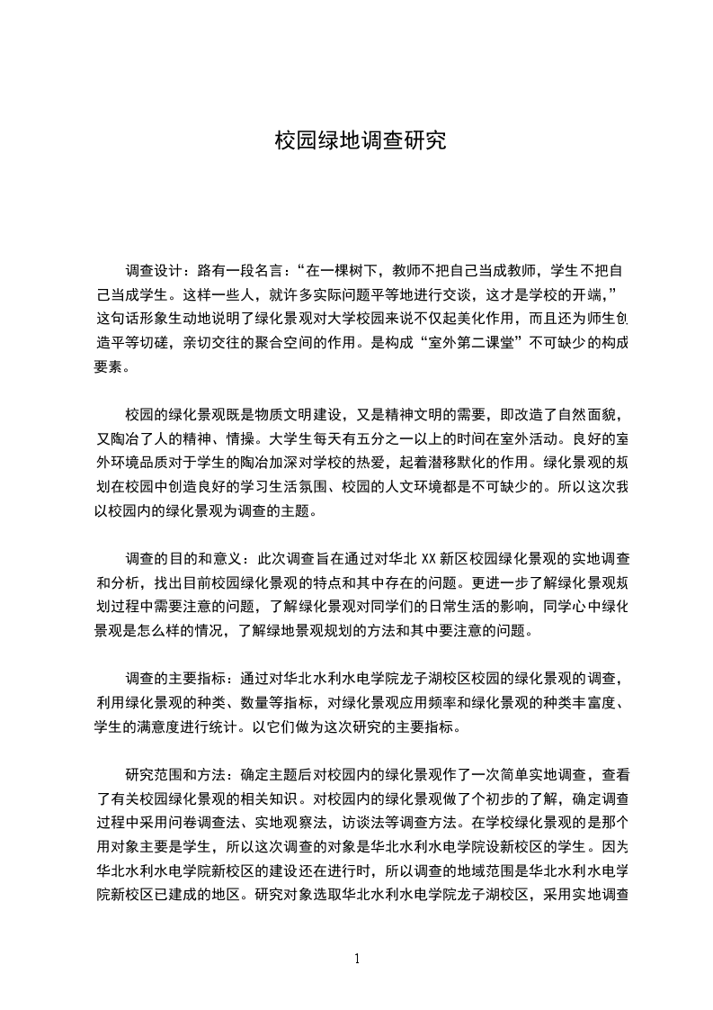 调查的目的和意义:此次调查旨在通过对华北XX新区校园绿化景观的实地调查和分析,找出目前校园绿化景观的特点和其中存在的问题。更进一步了解绿化景观规划过程中需要注意的问题,了解绿化景观对同学们的日常生活的影响,同学心中绿化景观是怎么样的情况,了解绿地景观规划的方法和其中要注意的问题。