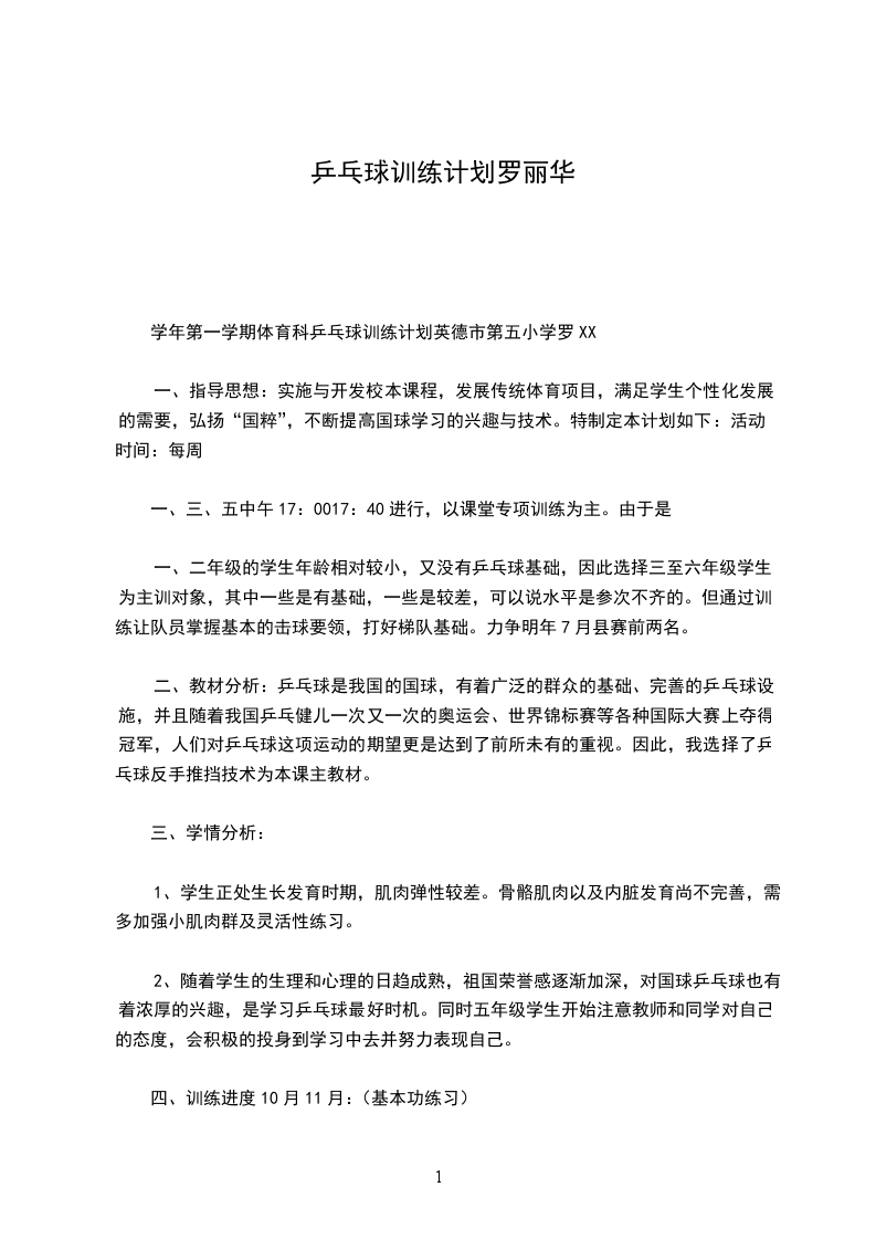 成都XX室双楠实验学校20__学年度乒乓球训练计划