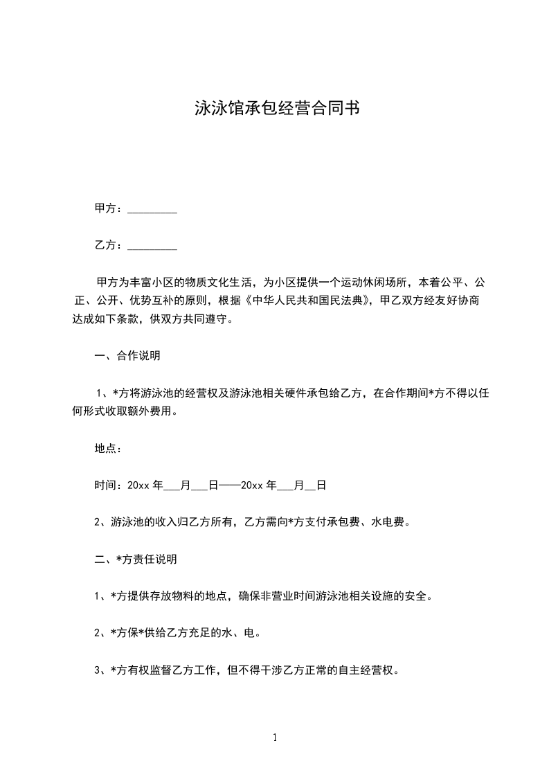 在承包经营过程中必须遵守国家有关法律法规,做到依法经营,自觉接受相关职能部门的监督管理,维护游泳馆的对外形象。在承包经营过程中不得转包和改变游泳馆及附属用房的体育功能。承包经营游泳馆及附属用房的一切经济、法律和安全的责任均由乙方承担,所涉的税收、规费等亦由乙方负责缴纳。承包经营游泳馆及附属用房期间,必须有明确的救生安全等责任措施,对游泳馆工作人员和顾客的安全负全责。承包经营游泳馆及附属用房期间,承担游泳馆及附属用房设备的保养、维修、管理和运行的所有费用并按规定及时支付。对学生上课应积级配合并做好各方面的服务工作,费用给予优惠,具体收费标准,甲乙双方另行协商并报县物价局核准。对老年人、残疾人应按规定给予优惠。本合同期限届满或终止,须将承租的游泳馆及附属用房按可经营现状完好地交还甲方(其中乙方投入的不动产归甲方无尝所有,可动产归乙方处置)。