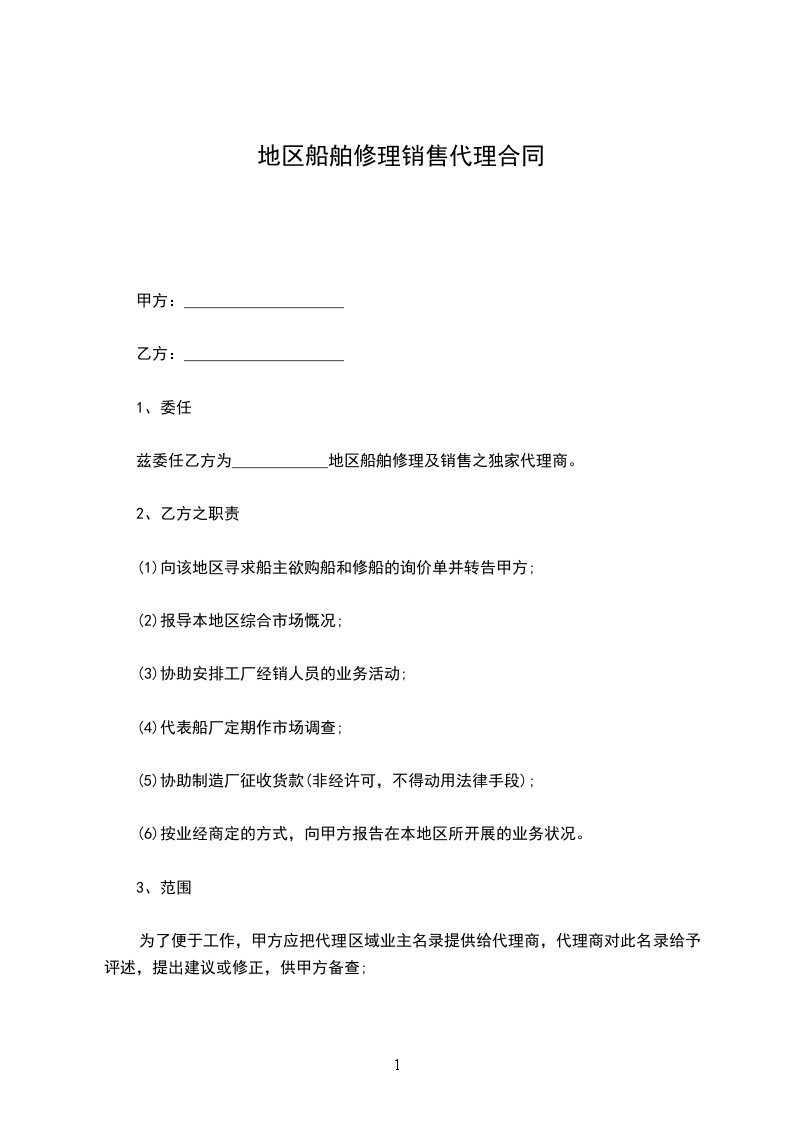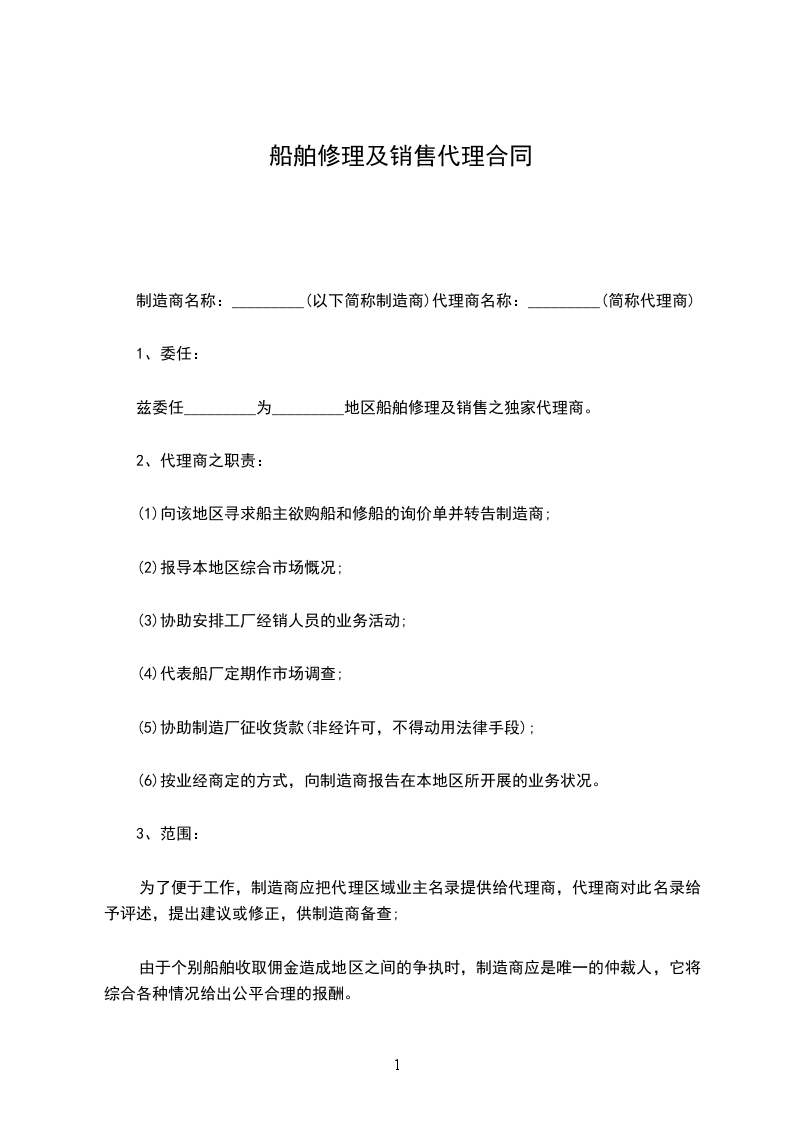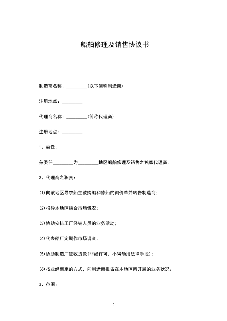 兹委任_________为_________地区船舶修理及销售之独家代理商。