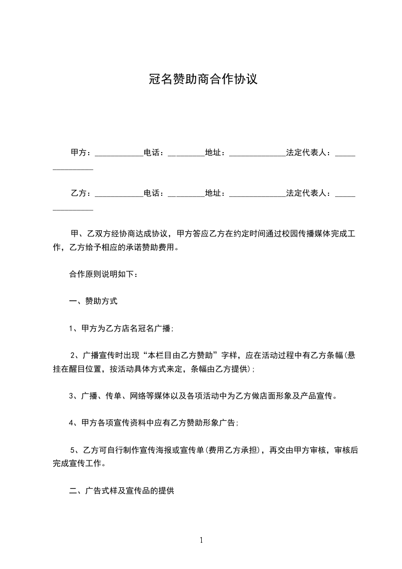 冠名赞助商合作协议