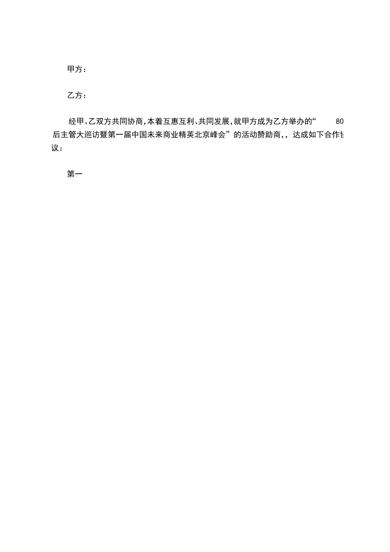 经甲、乙双方共同协商,本着互惠互利、共同发展,就甲方成为乙方举办的“80后主管大巡访暨第一届中国未来商业精英北京峰会”的活动赞助商,,达成如下合作协议: