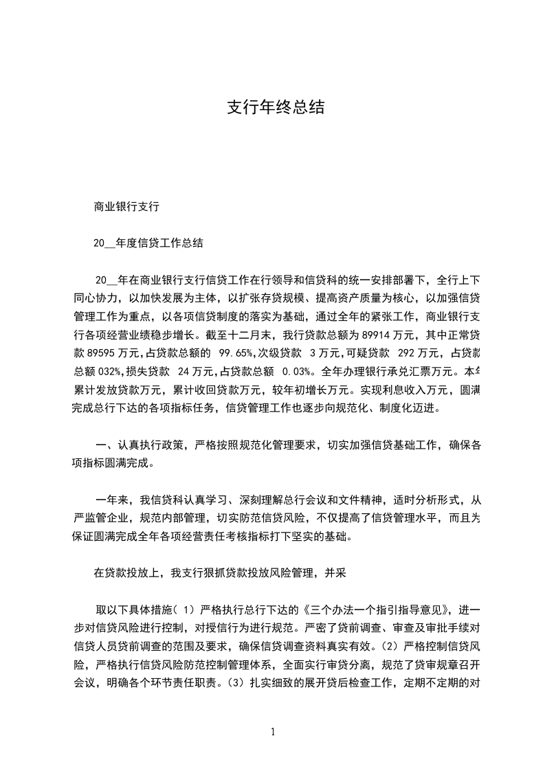 20__年在商业银行支行信贷工作在行领导和信贷科的统一安排部署下,全行上下同心协力,以加快发展为主体,以扩张存贷规模、提高资产质量为核心,以加强信贷管理工作为重点,以各项信贷制度的落实为基础,通过全年的紧张工作,商业银行支行各项经营业绩稳步增长。截至十二月末,我行贷款总额为89914万元,其中正常贷款89595万元,占贷款总额的99.65%,次级贷款3万元,可疑贷款292万元,占贷款总额032%,损失贷款24万元,占贷款总额0.03%。全年办理银行承兑汇票万元。本年累计发放贷款万元,累计收回贷款万元,较年初增长万元。实现利息收入万元,圆满完成总行下达的各项指标任务,信贷管理工作也逐步向规范化、制度化迈进。