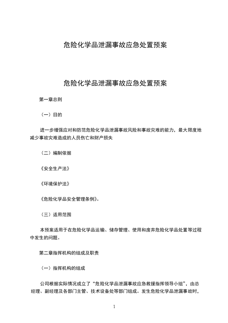 公司根据实际情况成立了“危险化学品泄漏事故应急救援指挥领导小组”,由总经理、副经理及各部门主管、技术设备处等部门组成。发生危险化学品泄漏事故时,以领导小组为基础,立即成立公司危险化学品泄漏事故应急救援指挥部,总经理任总指挥,副总经理任副总指挥,负责全公司应急救援工作的组织和指挥。总指挥:总经理