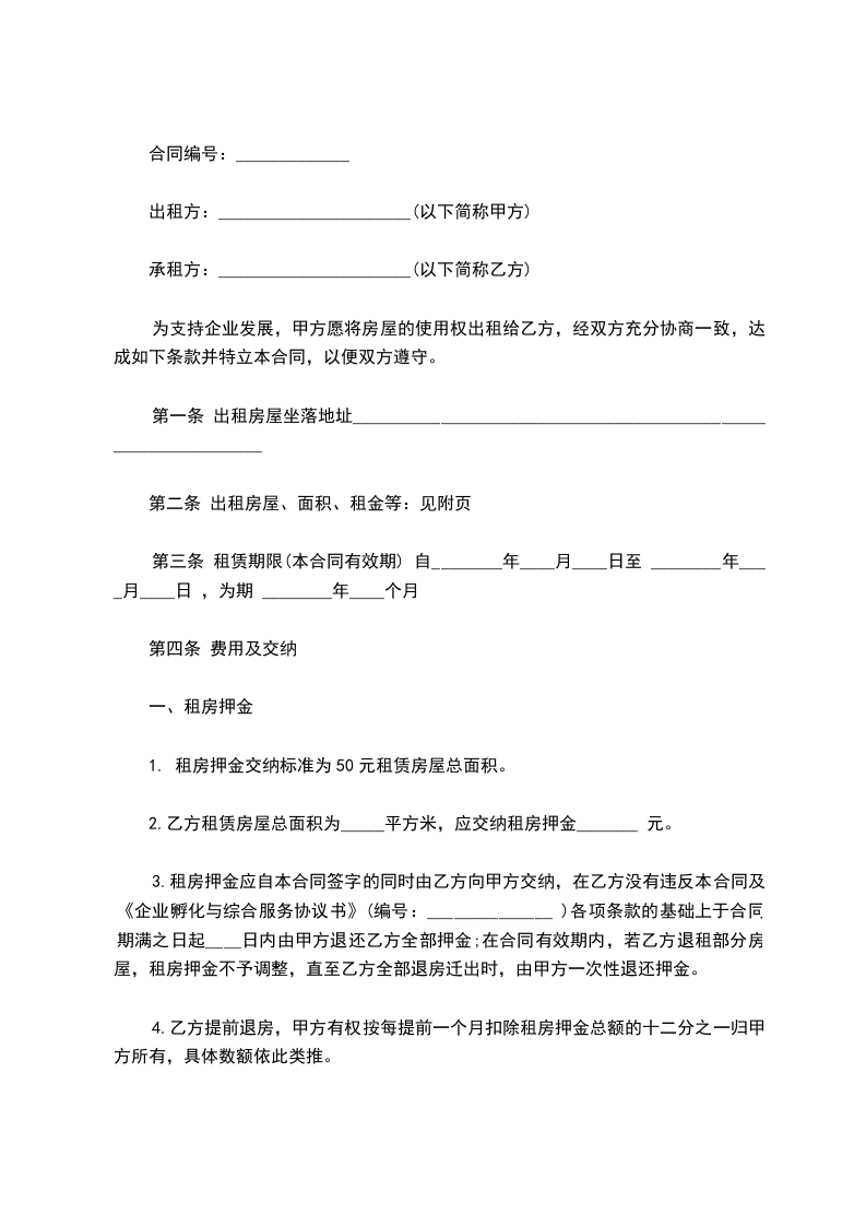 为支持企业发展,甲方愿将房屋的使用权出租给乙方,经双方充分协商一致,达成如下条款并特立本合同,以便双方遵守。