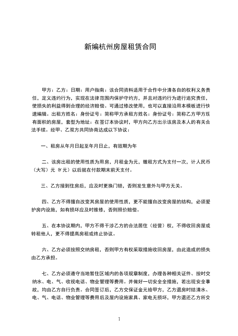 1.甲方应自乙方按合同交纳租房押金和租金之日起,按合同向乙方提供室内设施完好的房屋,否则,按本合同