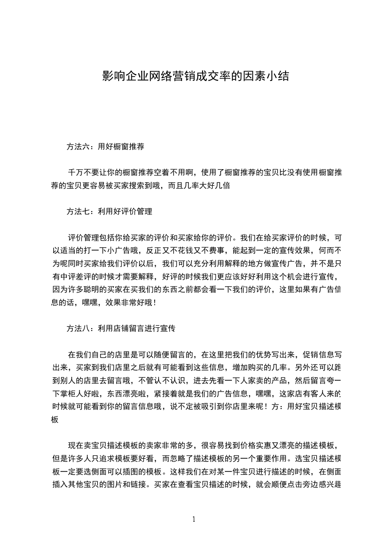 最难的一种推广,但产生的效果可能是成倍的。软文推广,写一篇带有店铺地址的文章、或者与店铺有关的故事,可以讲商品、讲信誉,也可以用购买者的角度讲故事,总之要宣扬好的,对软文进行到出去发,好的文章会被不断转载,会被点击。你的客户也就随之而来。如果不会写就去找,然后改改文字,改改地址,但效果也会减半的。