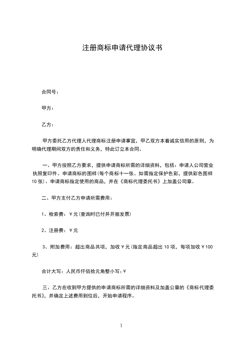 三、 乙方在收到甲方提供的申请商标所需的详细资料及加盖公章的《商标代理委托书》,并确定上述费用到位后,开始申请程序。