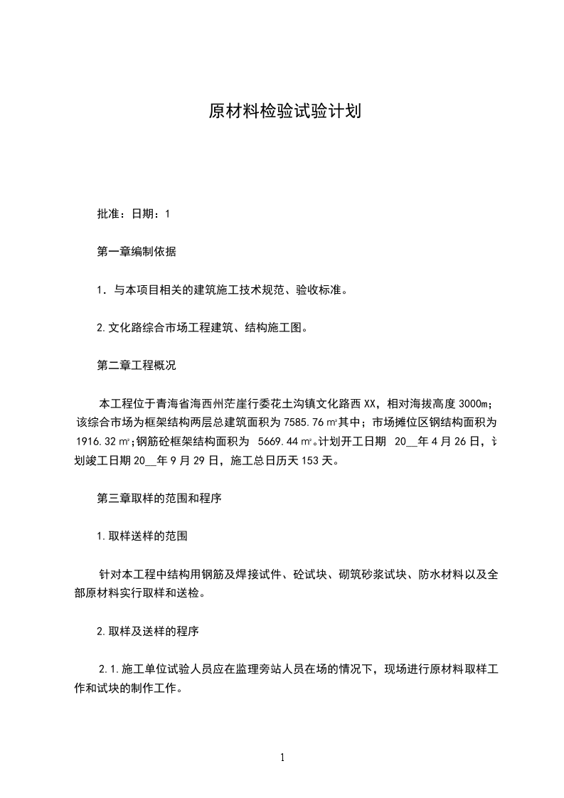 本工程位于青海省海西州茫崖行委花土沟镇文化路西XX,相对海拔高度3000m;该综合市场为框架结构两层总建筑面积为7585.76㎡其中;市场摊位区钢结构面积为1916.32㎡;钢筋砼框架结构面积为5669.44㎡。计划开工日期20__年4月26日,计划竣工日期20__年9月29日,施工总日历天153天。