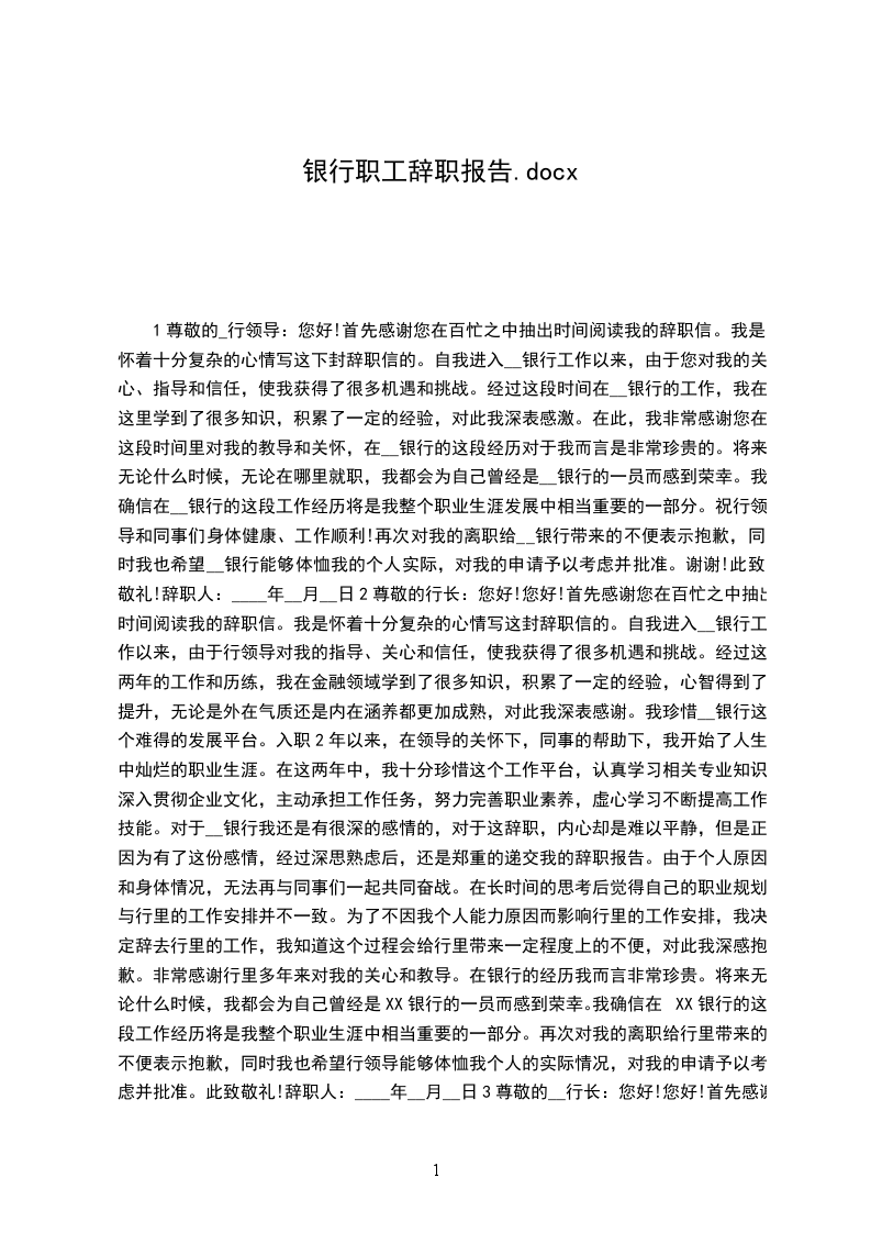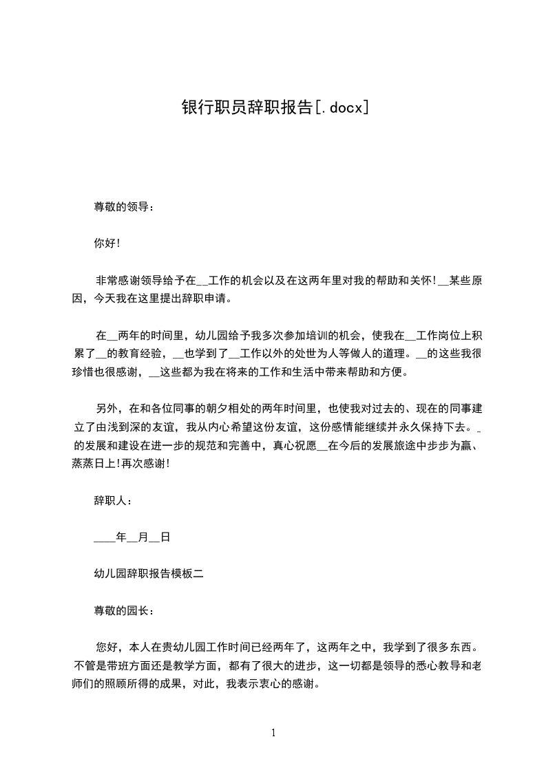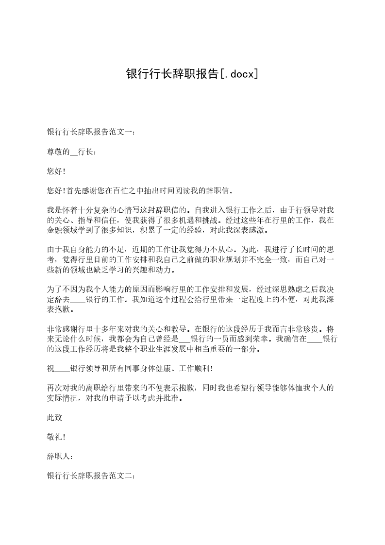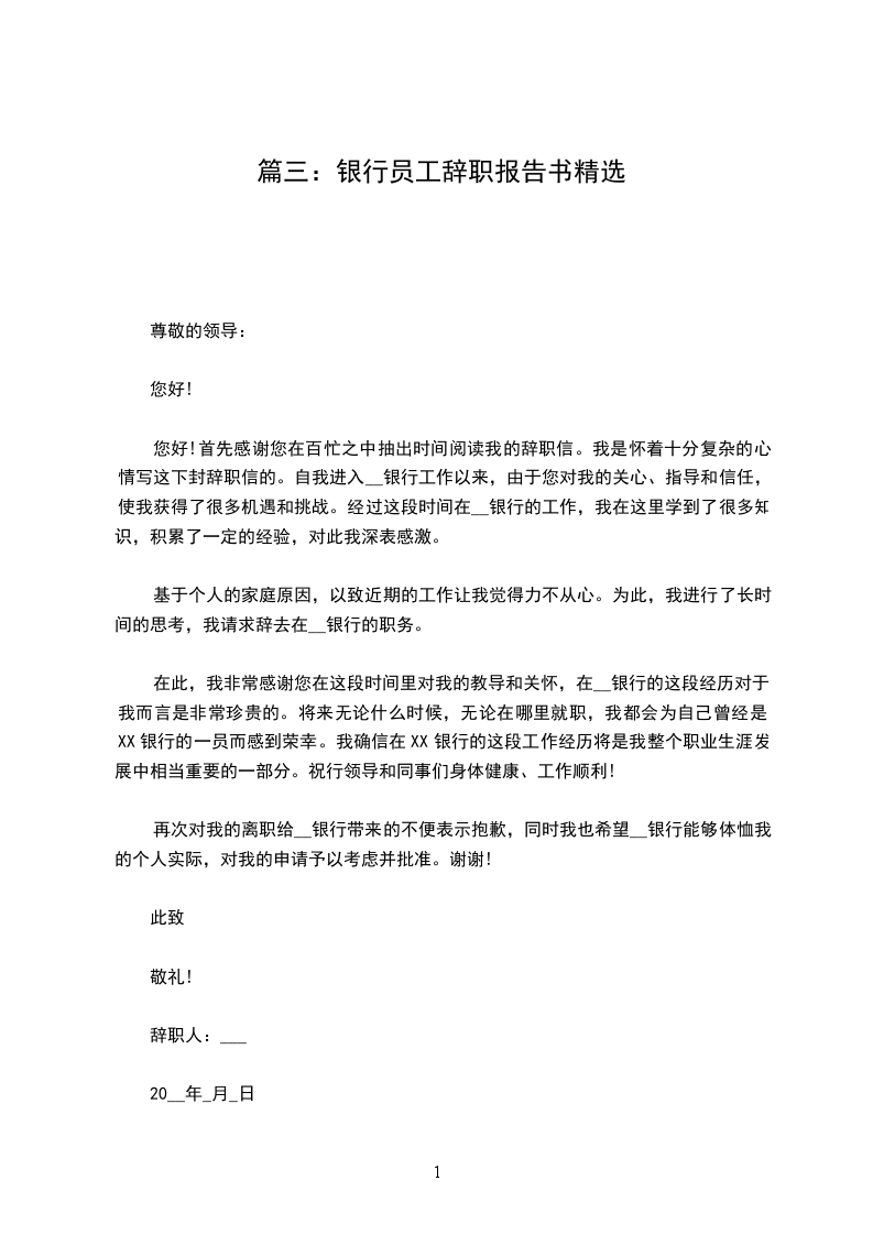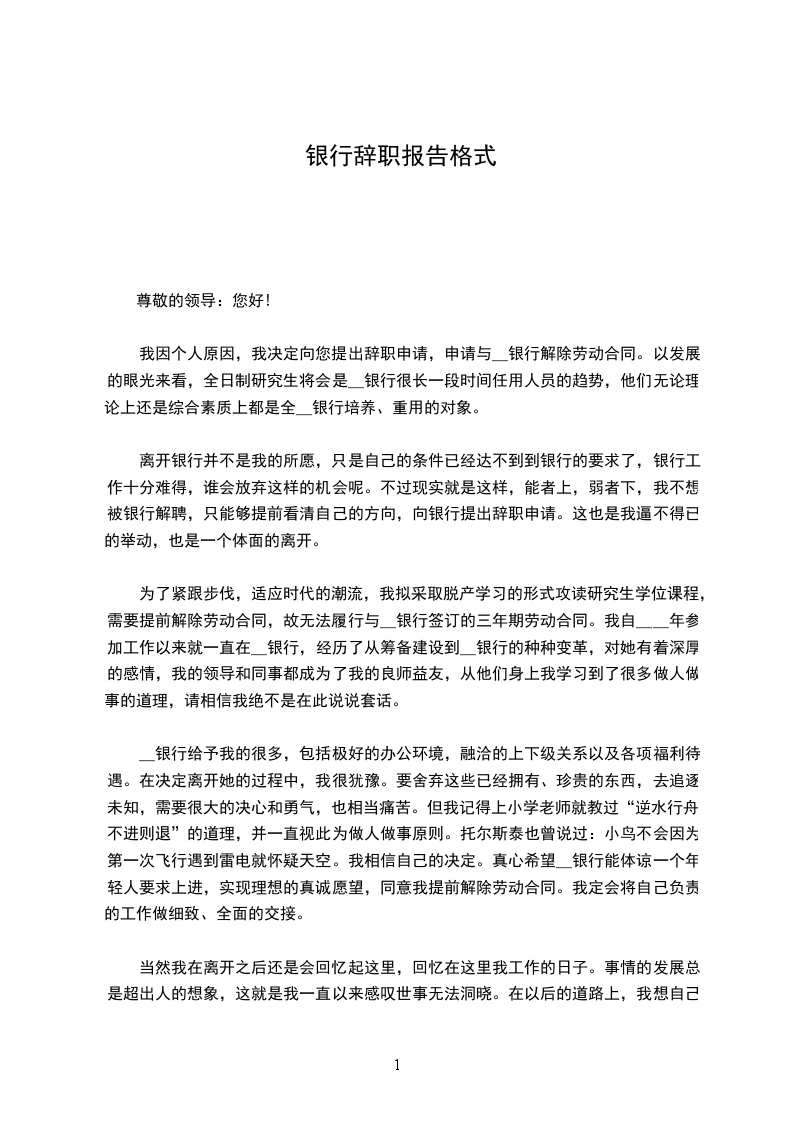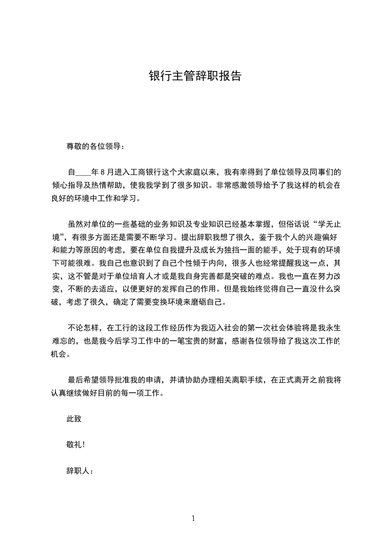 您好!首先感谢您在百忙之中抽出时间阅读我的辞职信。我是怀着十分复杂的心情写这下封辞职信的。自我进入__银行工作以来,由于您对我的关心、指导和信任,使我获得了很多机遇和挑战。经过这段时间在__银行的工作,我在这里学到了很多知识,积累了一定的经验,对此我深表感激。