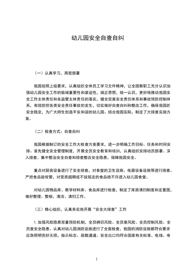 结合本次自查整改工作,我园对校舍、室内设施玩具,寝室用品,进行了一次彻底地检查。将各种游乐设施进行加固处理,对教具和玩具进行消毒和检查,将不合格的玩具进行销毁。室内桌椅和寝室床具也整体进行了一次维修,彻底检查了班级的物品摆放,消除了隐患。同时我园在管理制度、校园设施、安全意识和安全措施等方面都进行了进一步的改进和完善。教师的安全意识也进一步加强,对各项安全工作和应急处理办法有了更深入地了解,幼儿将会在一个优美的、安全的环境内健康、快乐地成长。