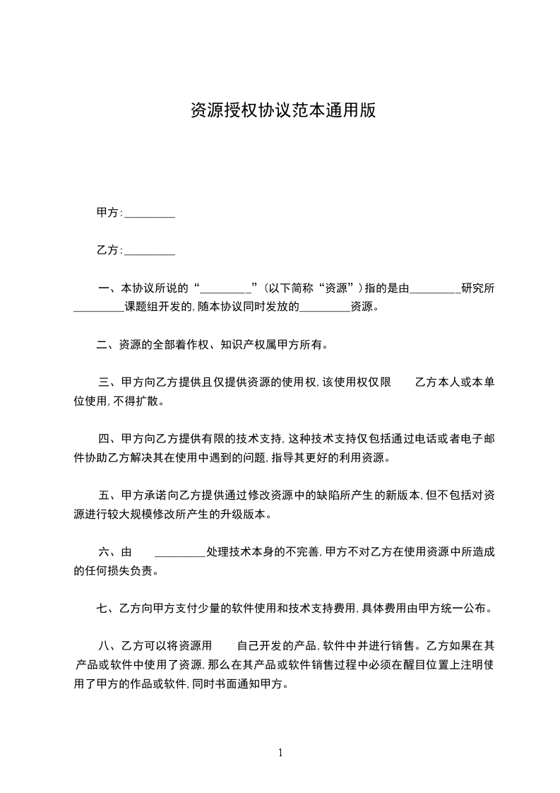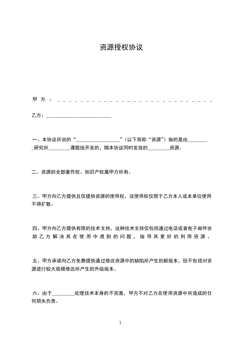 一、本协议所说的“__________________”(以下简称“资源”)指的是由_________研究所_________课题组开发的,随本协议同时发放的_________资源。
