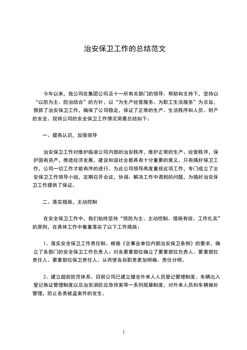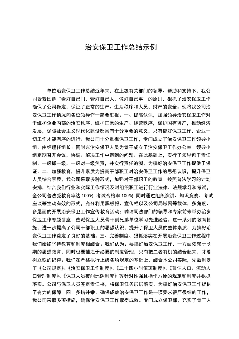 总之,我公司在治安保卫方面作了一些工作并取得了一定成绩,但是在很多方面还是有待进一步加强。我们决心在今后的工作中,加大措施,不断开拓保卫工作的新思路,提高保卫队伍的思想水平和业务素质,使公司治安保卫工作再上新台阶。