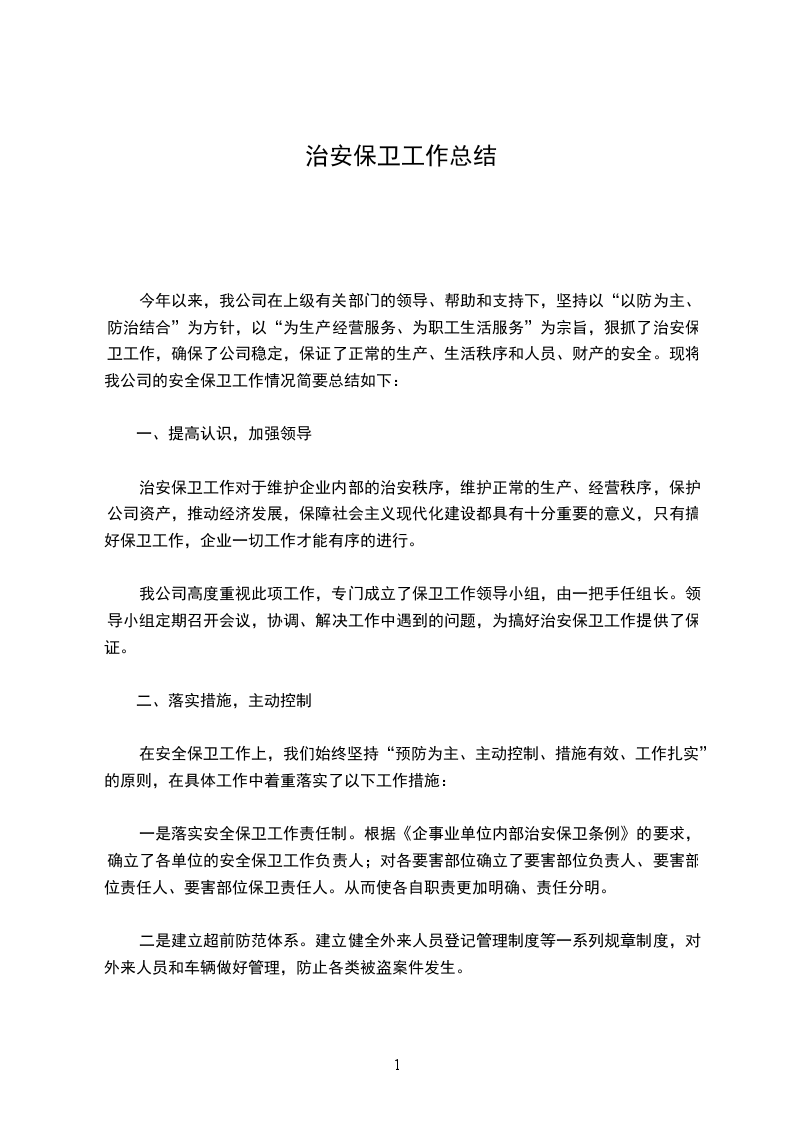 今年以来,我公司在上级有关部门的领导、帮助和支持下,坚持以“以防为主、防治结合”为方针,以“为生产经营服务、为职工生活服务”为宗旨,狠抓了治安保卫工作,确保了公司稳定,保证了正常的生产、生活秩序和人员、财产的安全。现将我公司的安全保卫工作情况简要总结如下: