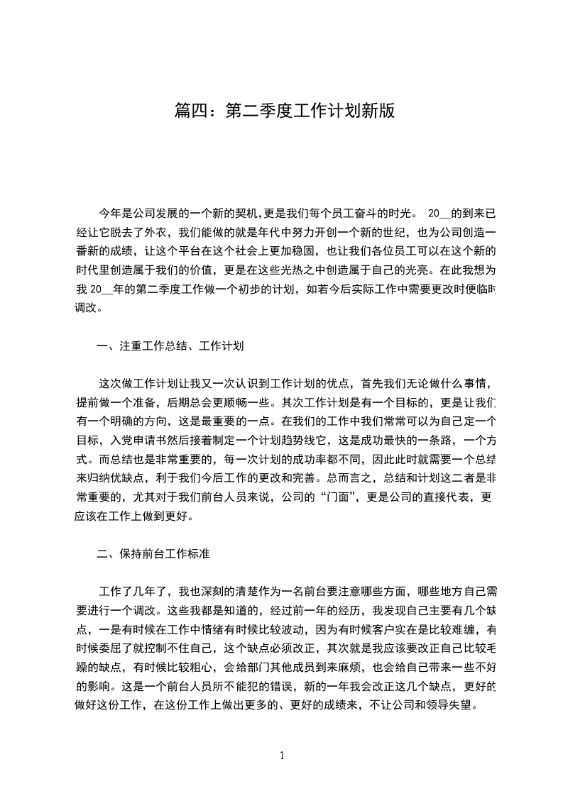 今年是公司发展的一个新的契机,更是我们每个员工奋斗的时光。20__的到来已经让它脱去了外衣,我们能做的就是年代中努力开创一个新的世纪,也为公司创造一番新的成绩,让这个平台在这个社会上更加稳固,也让我们各位员工可以在这个新的时代里创造属于我们的价值,更是在这些光热之中创造属于自己的光亮。在此我想为我20__年的第二季度工作做一个初步的计划,如若今后实际工作中需要更改时便临时调改。
