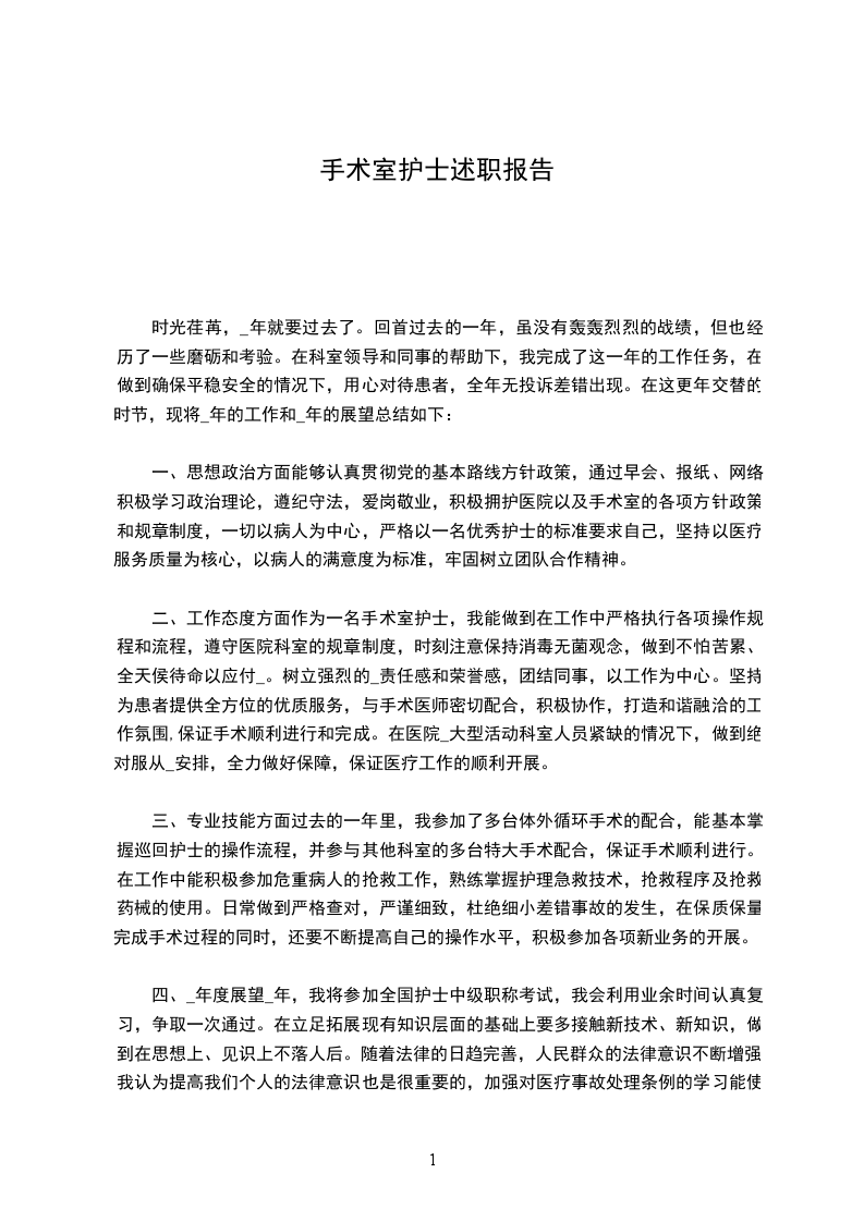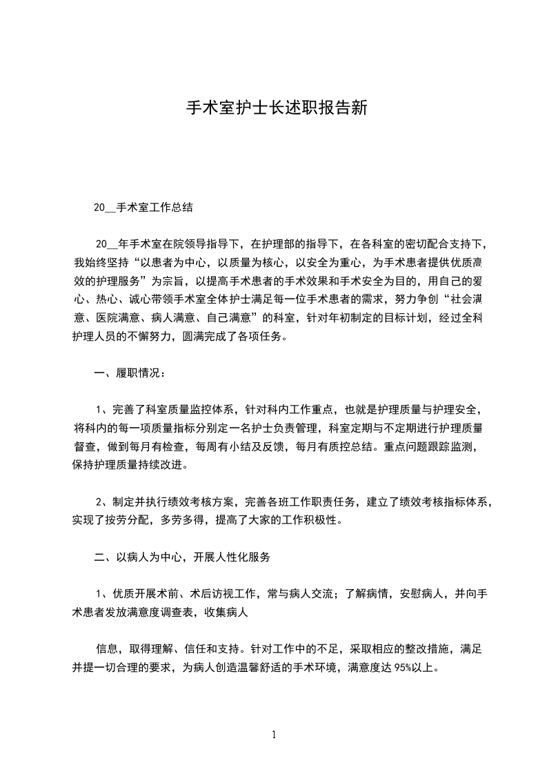 20__年手术室在院领导指导下,在护理部的指导下,在各科室的密切配合支持下,我始终坚持“以患者为中心,以质量为核心,以安全为重心,为手术患者提供优质高效的护理服务”为宗旨,以提高手术患者的手术效果和手术安全为目的,用自己的爱心、热心、诚心带领手术室全体护士满足每一位手术患者的需求,努力争创“社会满意、医院满意、病人满意、自己满意”的科室,针对年初制定的目标计划,经过全科护理人员的不懈努力,圆满完成了各项任务。