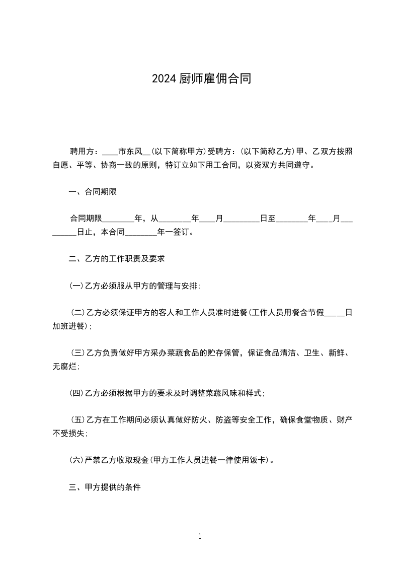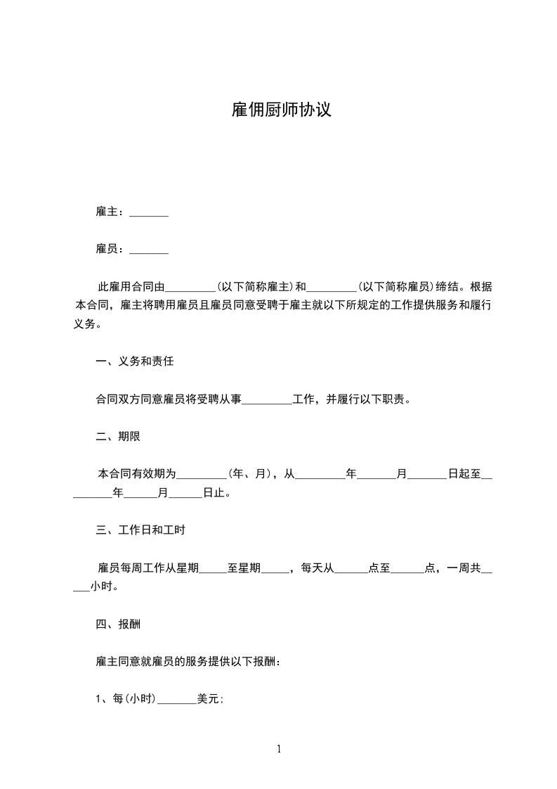 厨师雇佣合同范本一