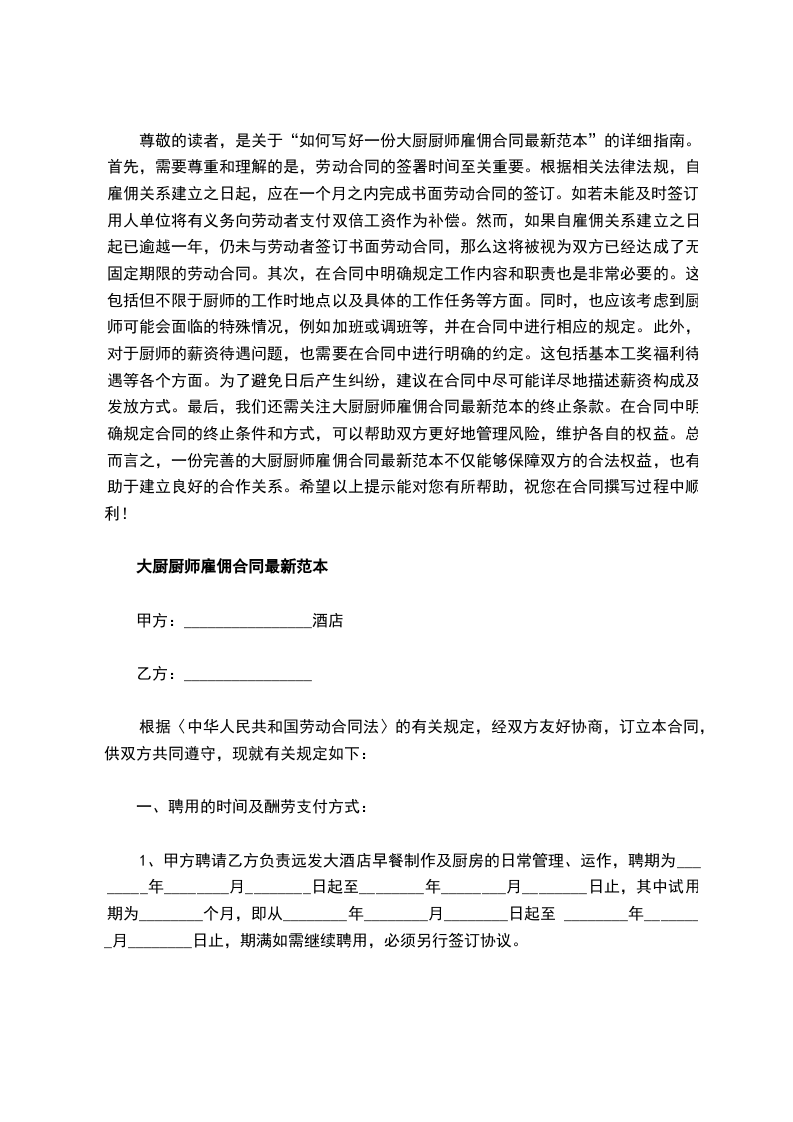 厨师雇佣合同范本二
