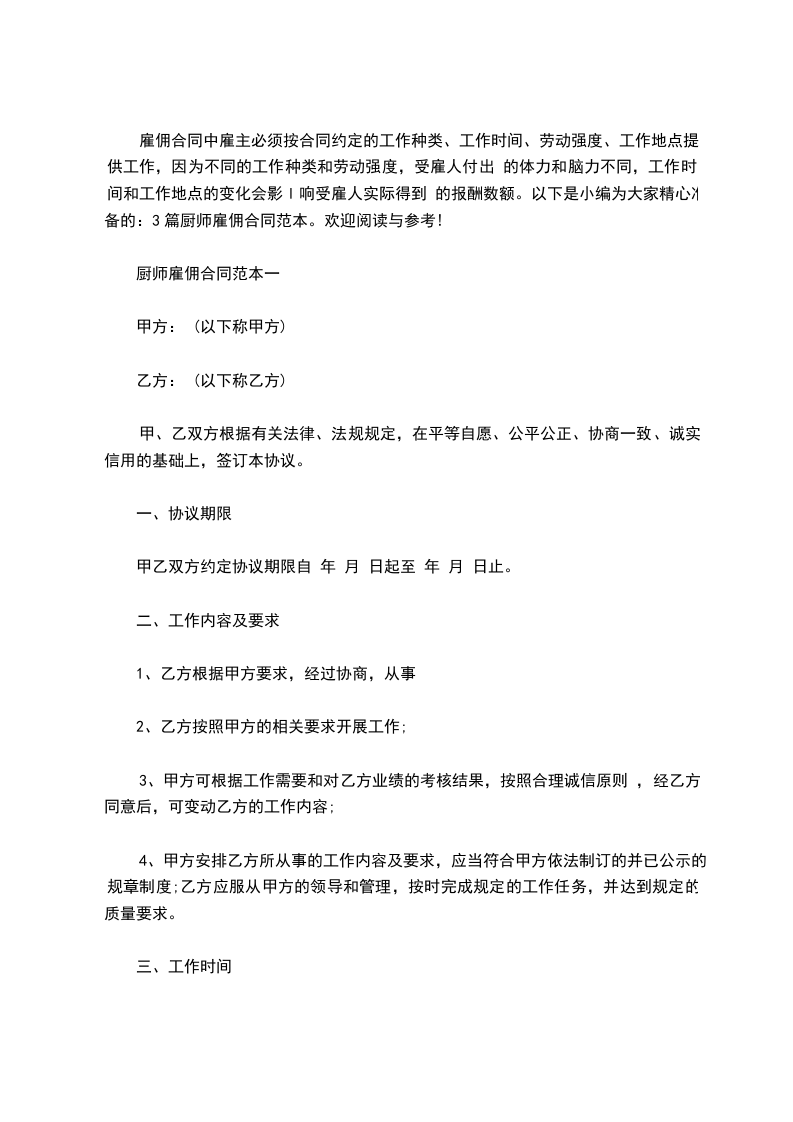 厨师雇佣合同范本三