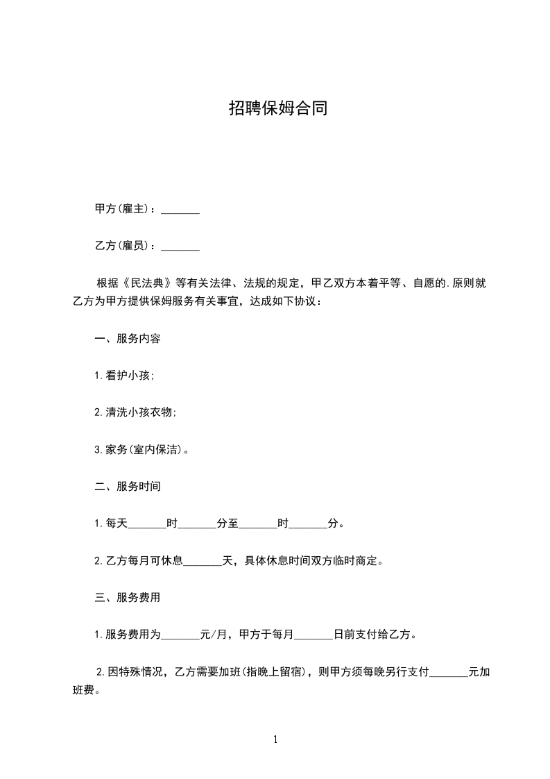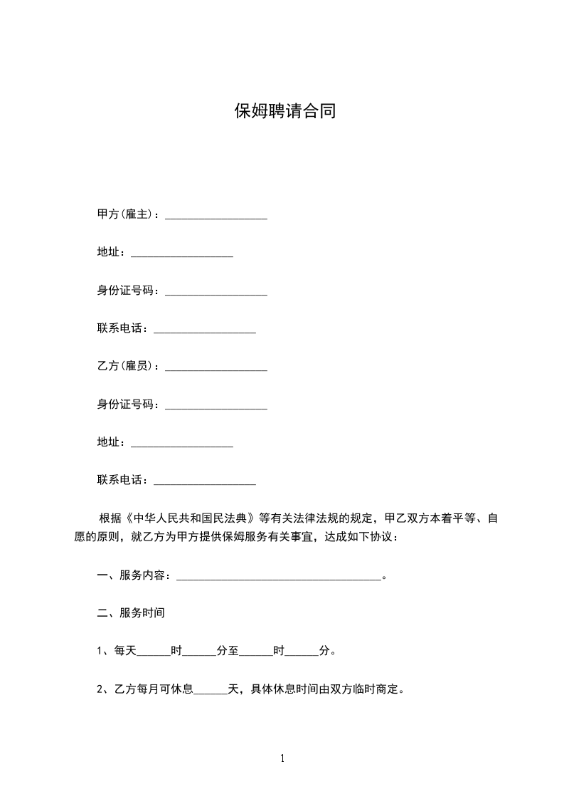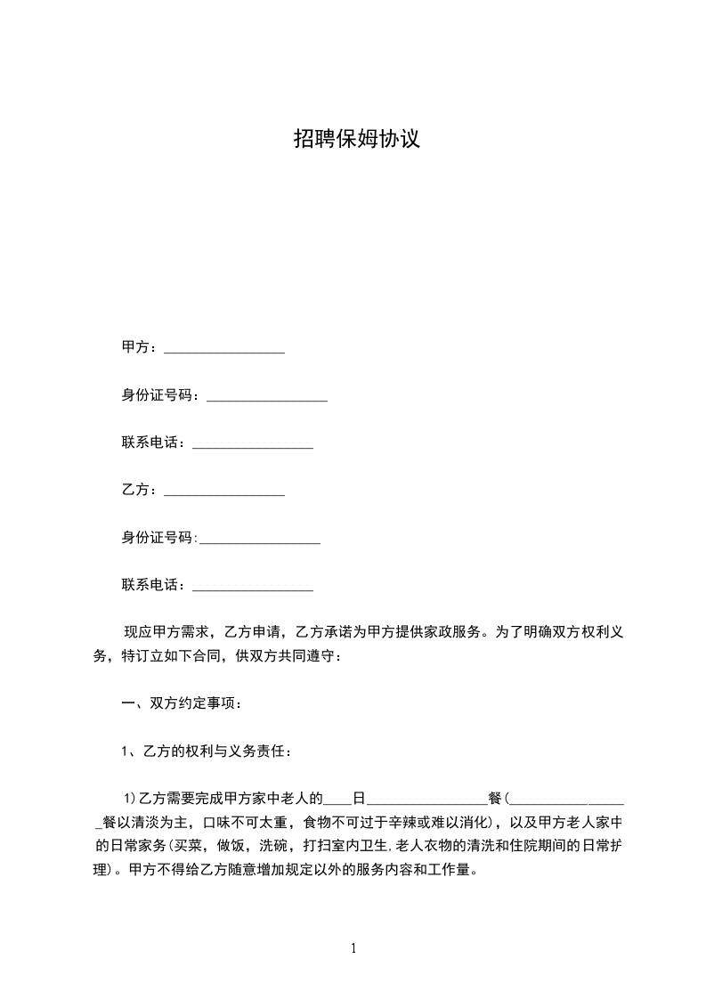 1.甲方聘请乙方主要从事幼儿学前教育、护理、家教等工作。