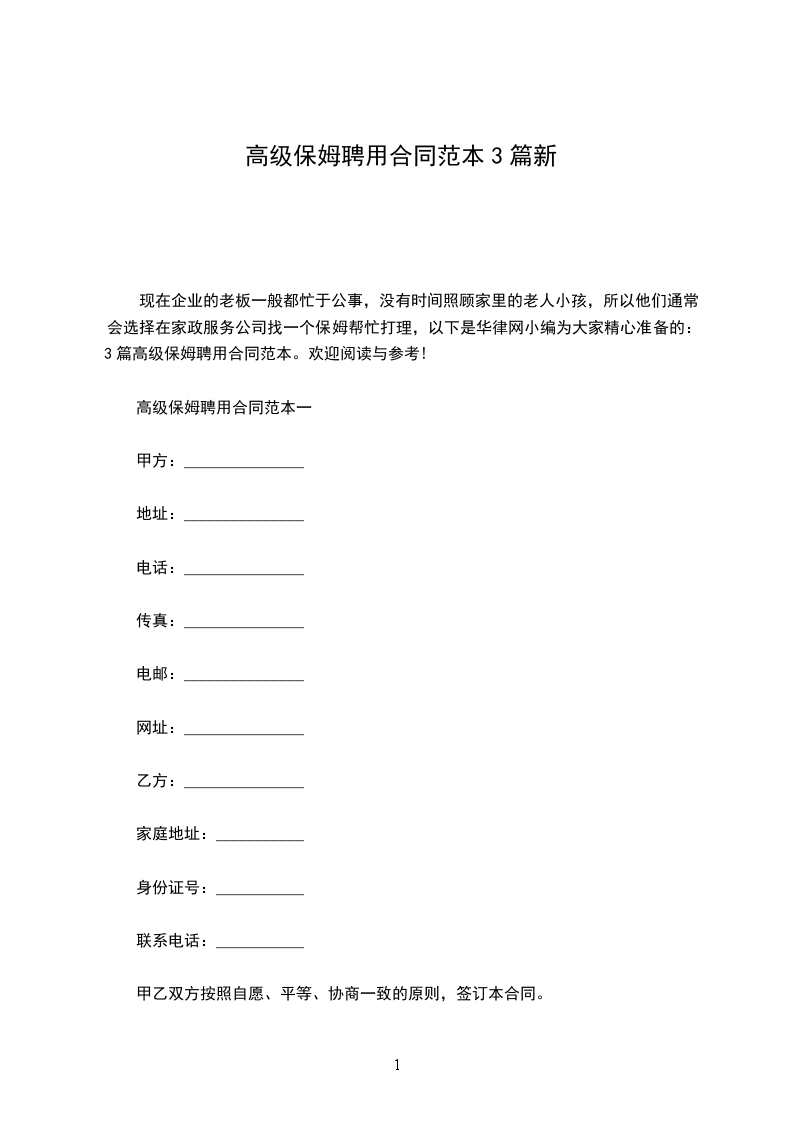 高级保姆聘用合同范本一