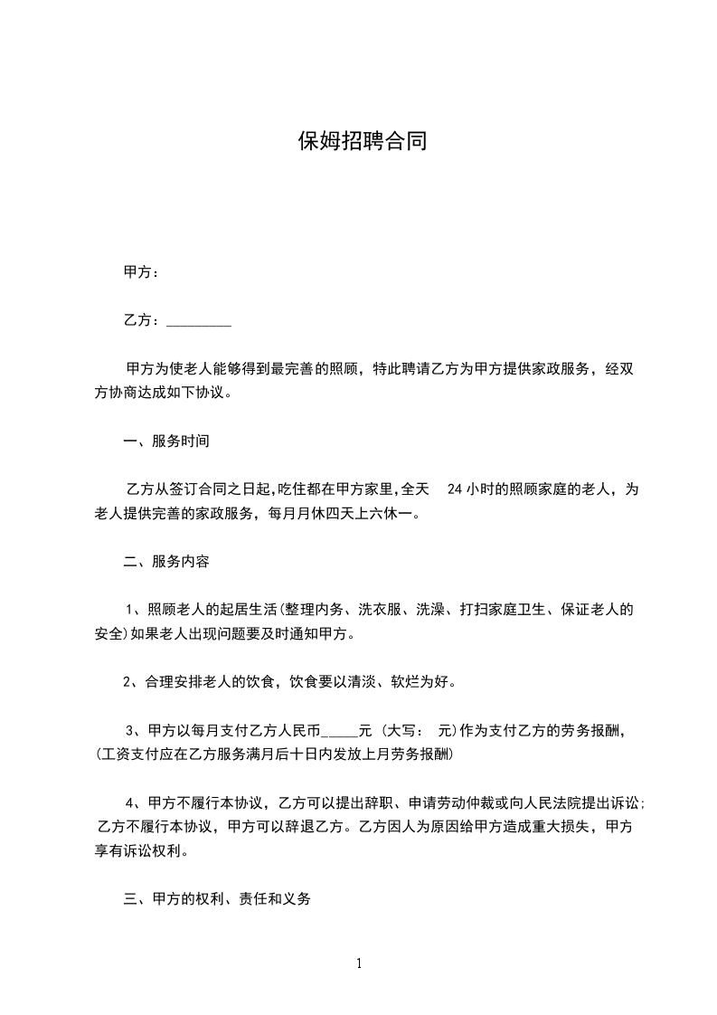 1. 乙方的服务内容主要包括:照看孩子,做家务,做饭,做清洁。