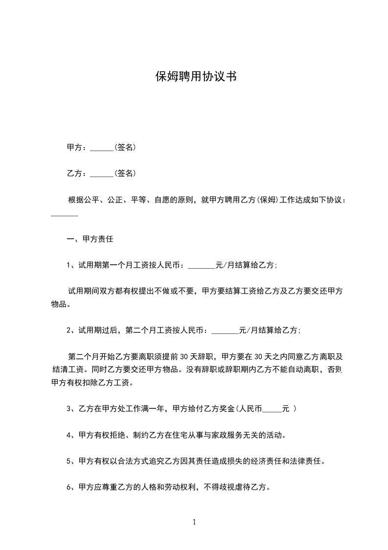 今特聘请乙方到甲方家中做家政服务,经甲、乙方友好协商,达成如下协议: