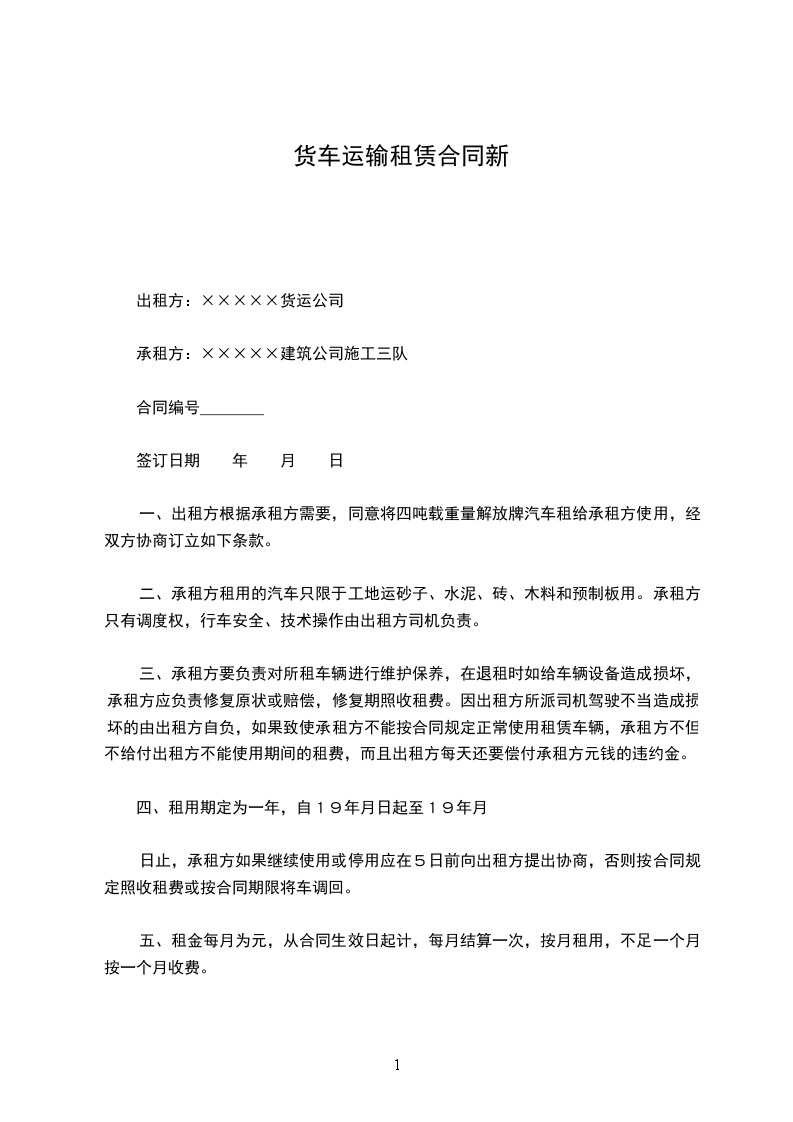 一、出租方根据承租方需要,同意将四吨载重量解放牌汽车租给承租方使用,经双方协商订立如下条款。