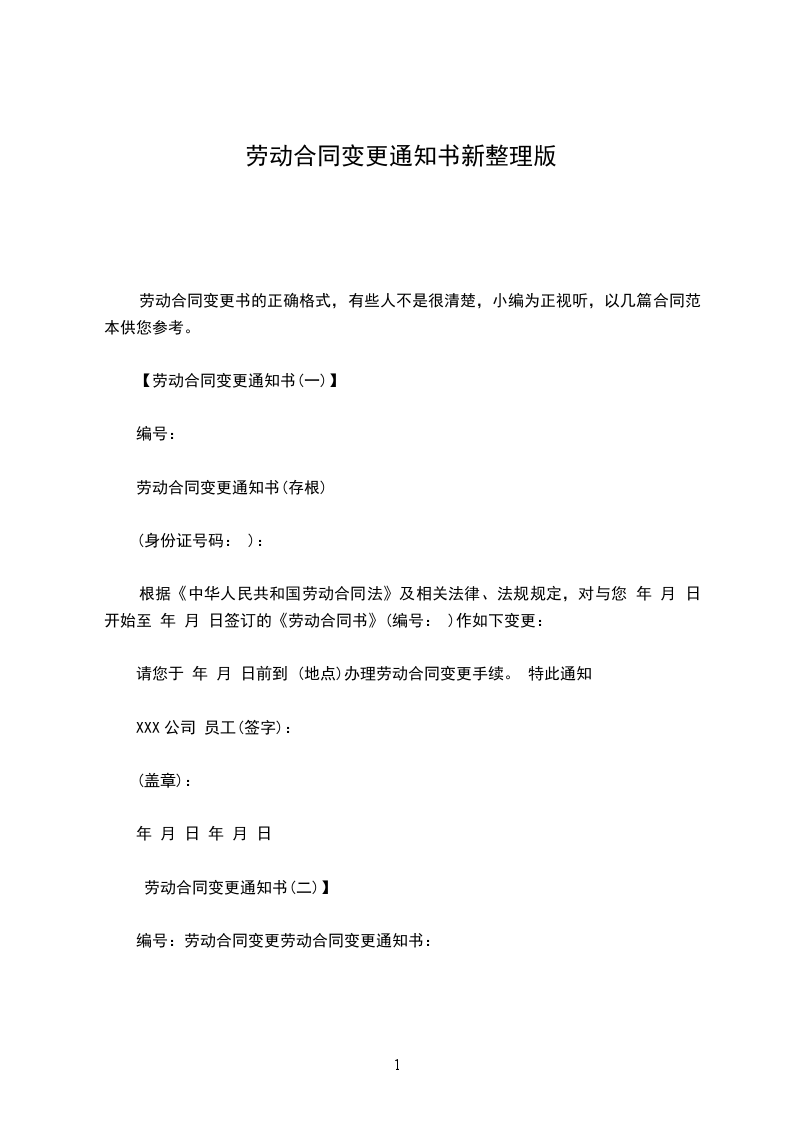 【劳动合同变更通知书(一)】
