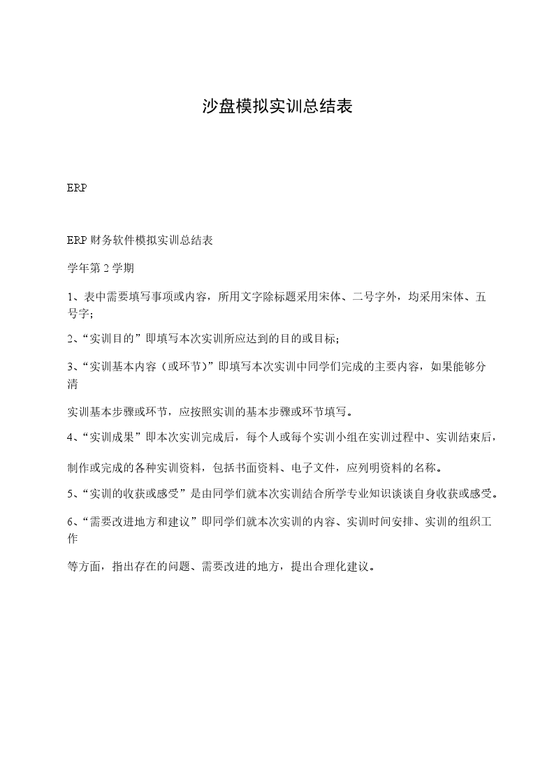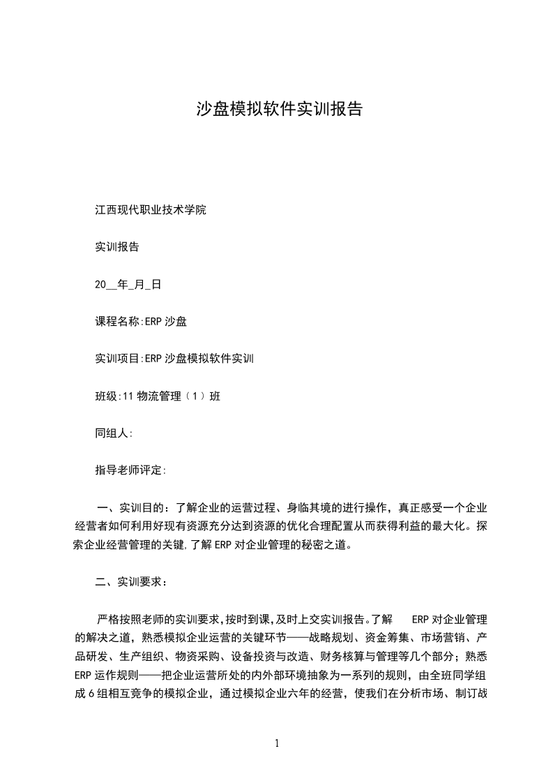 关于《ERP沙盘模拟训练》的总结报告在为期四天的《ERP沙盘模拟训练》实训过程中,小组成员通过查阅资料,与同学交流实训总结,同时通过向指导老师征询指导意见,了解了ERP沙盘模拟中的涉及环节,通过理论联系实践加深了对ERP沙盘模拟理解和认识。ERP沙盘模拟通过直观的企业经营沙盘,来模拟企业运行状况。让我们在分析市场、制定战略、组织生产、整体营销和财务结算等一系列活动中体会企业经营运作的全过程,认识到企业资源的有限性。既能调动我们的主观能动性,又可以让我们身临其境,真正感受一个企业经营者直面的市场竞争的精彩与残酷,承担的经营风险与责任,从而深刻理解ERP的管理思想,领悟科学的管理规律,提升管理能力。