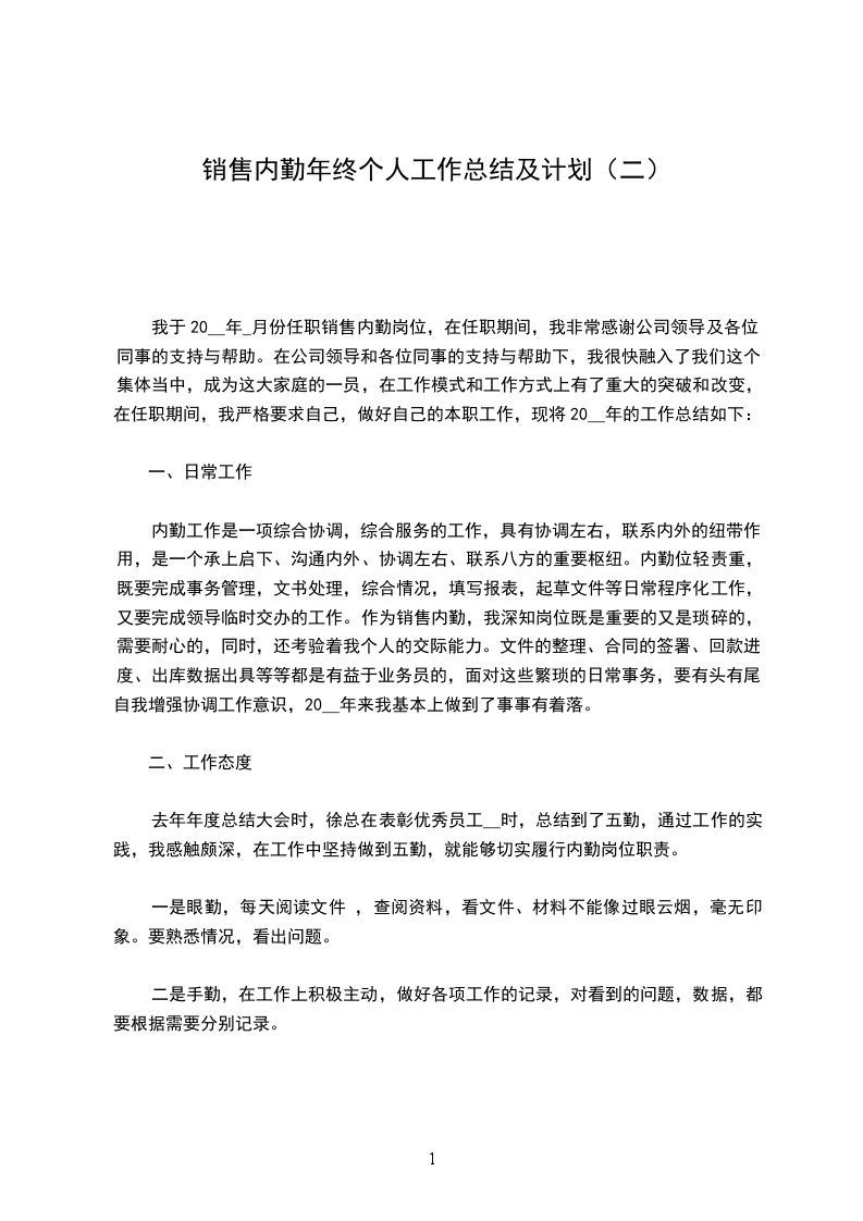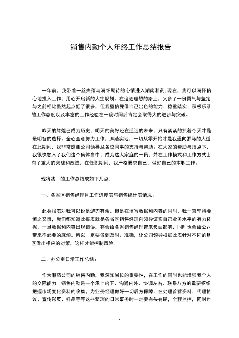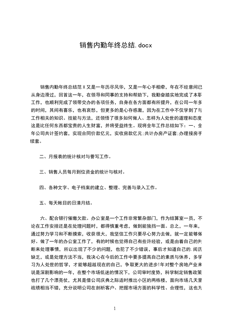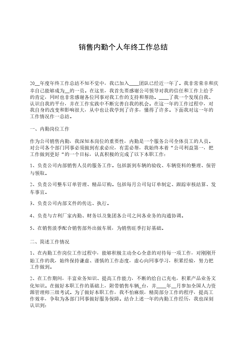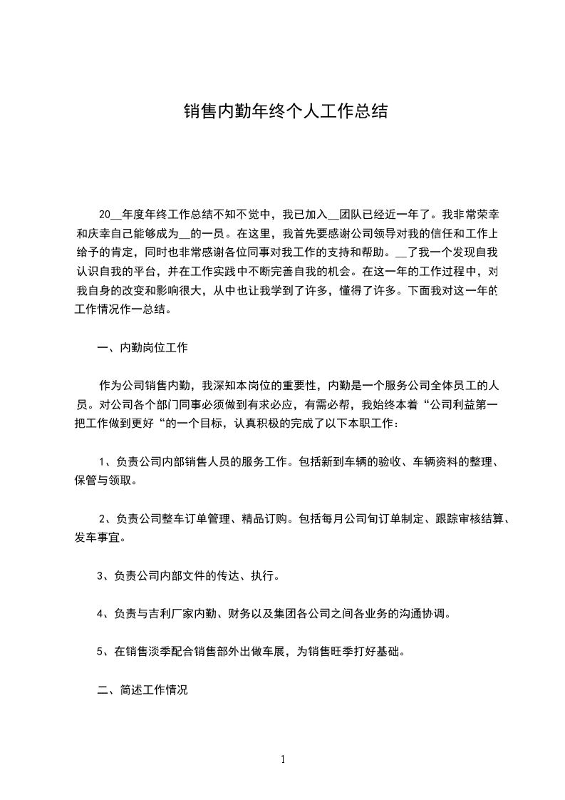 我于20__年_月份任职销售内勤岗位,在任职期间,我非常感谢公司领导及各位同事的支持与帮助。在公司领导和各位同事的支持与帮助下,我很快融入了我们这个集体当中,成为这大家庭的一员,在工作模式和工作方式上有了重大的突破和改变,在任职期间,我严格要求自己,做好自己的本职工作,现将20__年的工作总结如下: