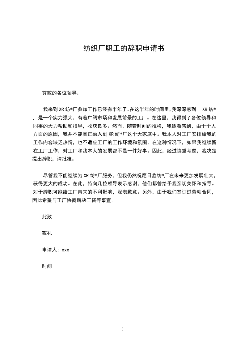 我来到XR纺*厂参加工作已经有半年了。在这半年的时间里,我深深感到XR纺*厂是一个实力强大,有着广阔市场和发展前景的工厂。在这里,我得到了各位领导和同事的大力帮助和指导,收获良多。然而,随着时间的推移,我逐渐感到,由于个人方面的原因,我并不能真正融入到XR纺*厂这个大家庭中。我本人对工厂安排给我的工作内容缺乏热情,也不适应工厂的工作环境和氛围。在这种情况下,如果我继续留在工厂工作,对工厂和我本人的发展都不是一件好事。因此,经过慎重考虑,我决定提出辞职,请批准。
