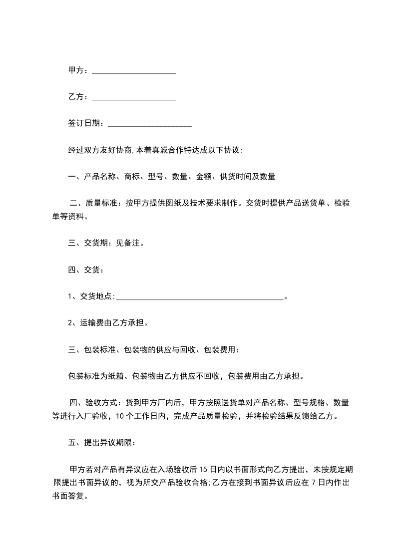 第一条乙方向甲方购买____________________________器。自合同签订之日起______日内,甲方将标的物承运到乙方的工厂。