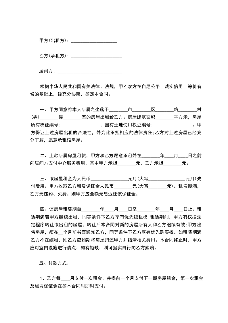 二、上款所属房屋租赁,甲方和乙方愿意承租并在________年____月____日之前向居间方支付中介服务费用,其中甲方承担________元,乙方承担________元。